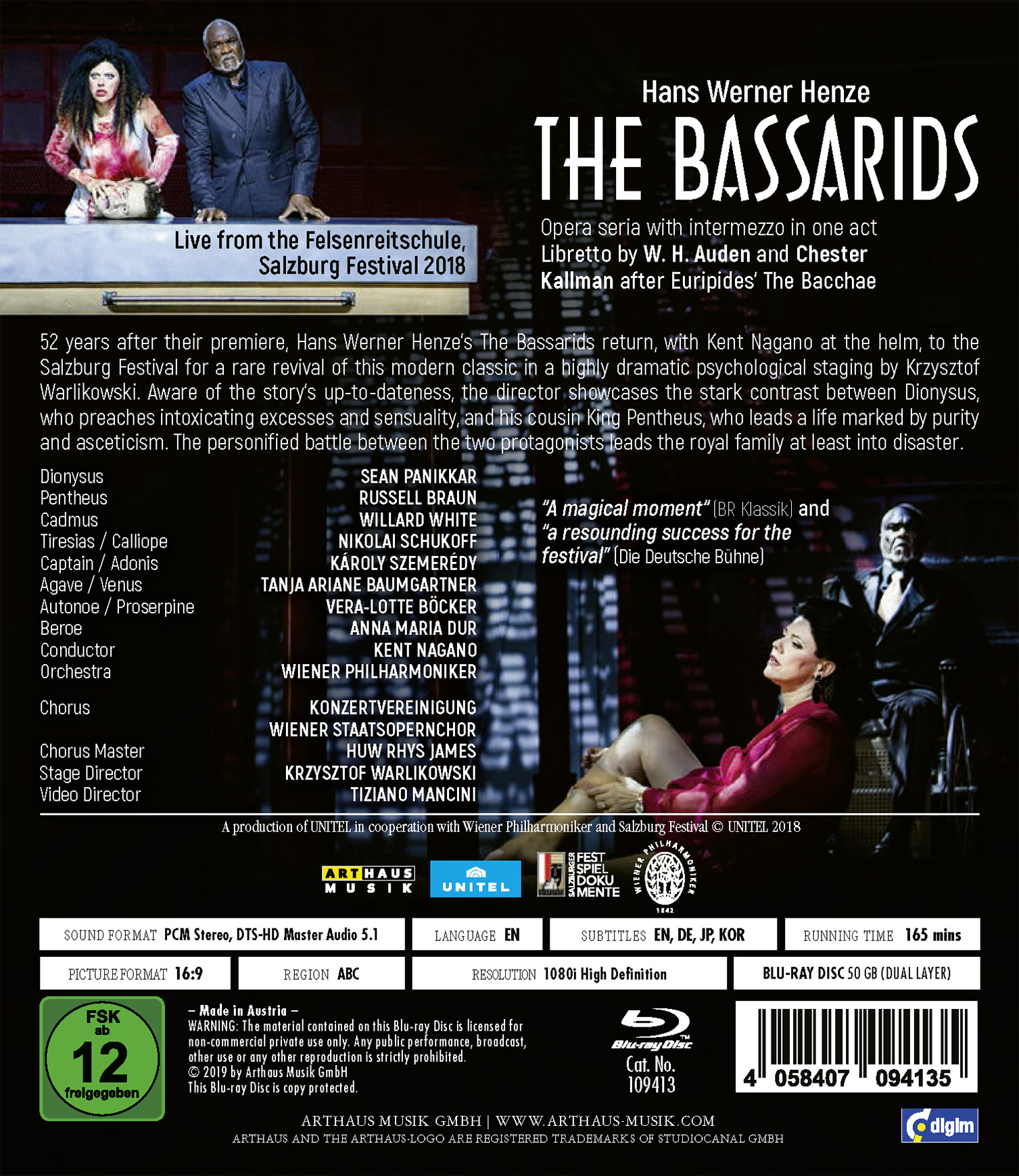 Star-Dirigent Kent Nagano, der Henze sehr nahe stand, nahm für die Festival-Aufführung der Bassariden den etwa 20-minütigen Ausschnitt "The Judgment of Calliope" aus der Originalpartitur mit auf, um dem dionysischen Kult in der Oper eine neue Dimension zu verleihen. Die Aufführung in der Felsenreitschule verzeichnete eine ausnahmslos herausragende Besetzung mit dem jungen US-Tenor Sean Panikkar in der Rolle von Dionysos, Russel Braun als seinen Gegner Pentheus, aber auch Tanja Ariane Baumgartner und Vera-Lotte Böcker, die auf höchstem Niveau gesungen haben. Kurzum: "Eine absolut packende Neuproduktion" (Frankfurter Allgemeine Zeitung)