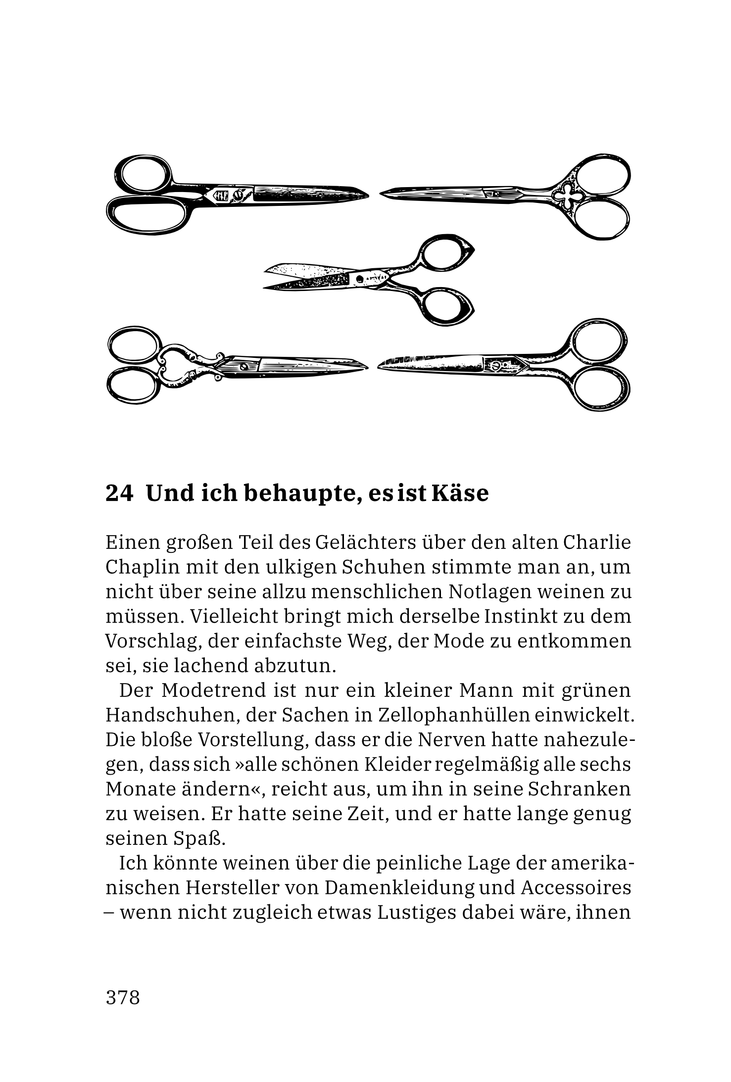 Millionen und Abermillionen von Frauen gehen Jahr für Jahr einkaufen. Sie sind groß und klein, dick und dünn, fröhlich und deprimiert. Die einen bekleiden ihren Körper nur, um nicht zu frieren oder nicht nackt zu gehen. Die anderen wählen ihre Garderobe sorgfältig aus, um in Palm Beach zu überwintern oder die Rennen in Ascot zu besuchen. Die erste, unvermeidliche Wahl ist: Können sie so viel zahlen, dass sie genau bekommen, was sie möchten, oder sind sie der Gnade der Massenproduktion ausgeliefert? Können sie sich Stil kaufen – oder müssen sie mit Mode vorlieb nehmen? [...] Ich, Elizabeth Hawes, habe in Paris Kleidung verkauft, gestohlen und entworfen. Ich habe für Zeitungen, Zeitschriften und für Kaufhäuser über die Pariser Mode berichtet. Ich habe in Europa mit Einkäuferinnen aus Amerika gearbeitet. In den USA baute ich meinen Elfenbeinturm in der 67. Straße in New York. Dort genieße ich das Privileg, schöne und teure Kleidung nach Maß für diejenigen anzufertigen, die sich meine Erzeugnisse leisten können. [...] Gleichzeitig entwarf ich in New York ein Jahr lang für einen günstigen Bekleidungsgroßhändler. Ich entwarf Taschen, Handschuhe, Pullover, Hüte, Pelze und Stoffe für Kleiderfabrikanten. Ich arbeitete mit Werbeagenturen und Kaufhäusern bei der PR für diese Artikel zusammen. All diese Erfahrungen haben mich davon überzeugt, dass 95 Prozent des Modegeschäfts eine Zeit- und Energieverschwendung ist, soweit es die breite Öffentlichkeit betrifft. Es dient nur dazu, bei den Kunden, die von der Stange kaufen, im Gespräch zu bleiben und ihnen das Leben sauer zu machen.