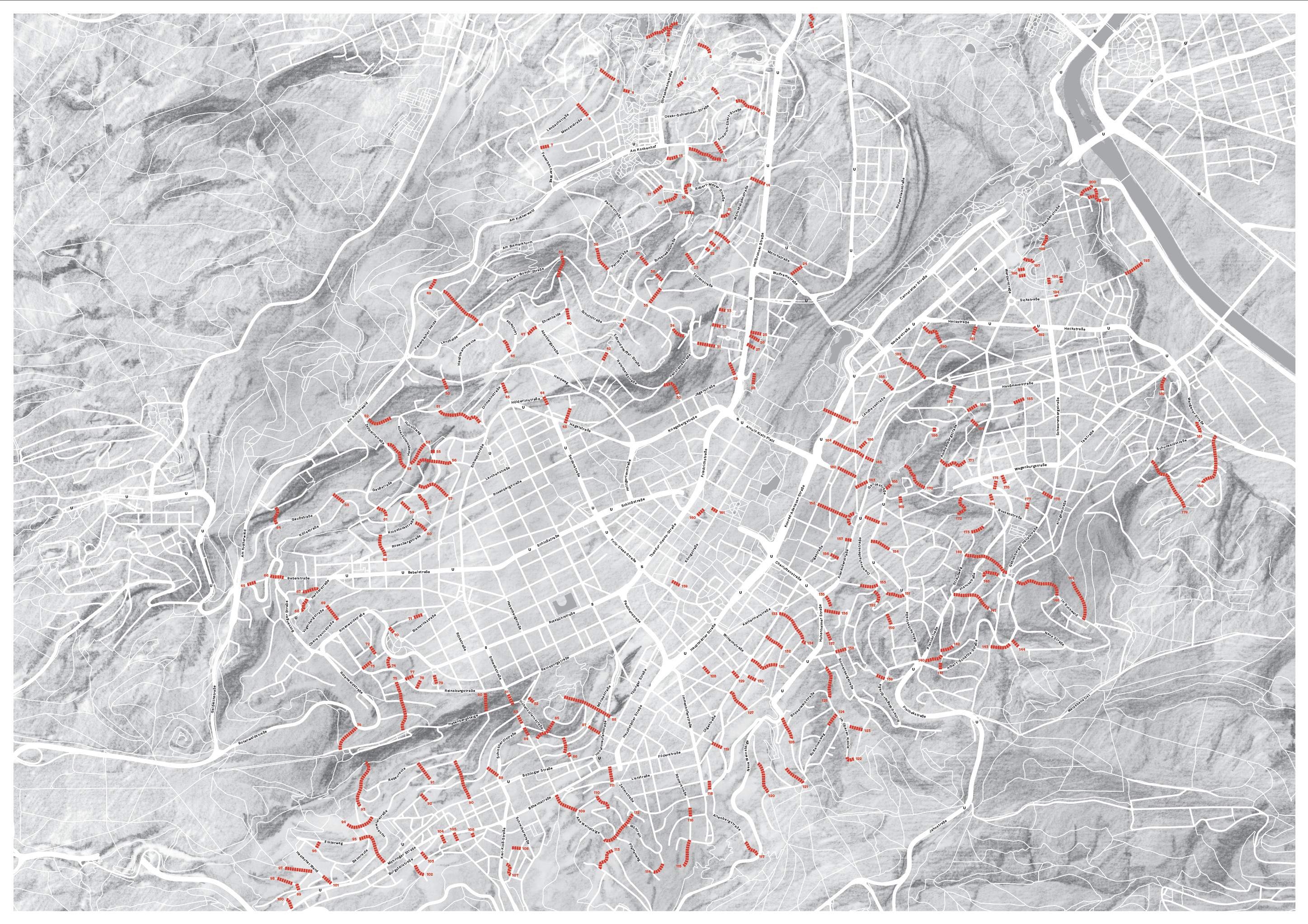 Die Rückseite führt die Staffel-Namen auf, nach Stadtvierteln nummeriert und alphabetisch sortiert, mit Verweisen in das Buch ›Stuttgarter Stufennotizen‹: Über ein Jahr hinweg erklimmen Christina Schmid und Sabine Fessler die Stuttgarter Stäffele und verweilen auf ihnen. Sie beobachten, lauschen und protokollieren das Treppengeschehen zwischen den Ebenen im hügeligen Stuttgart. Die eine schreibt, die andere zeichnet. So entsteht nach und nach ein ganz eigener Blick auf diese grünen Oasen und Zwischenräume der Stadt.