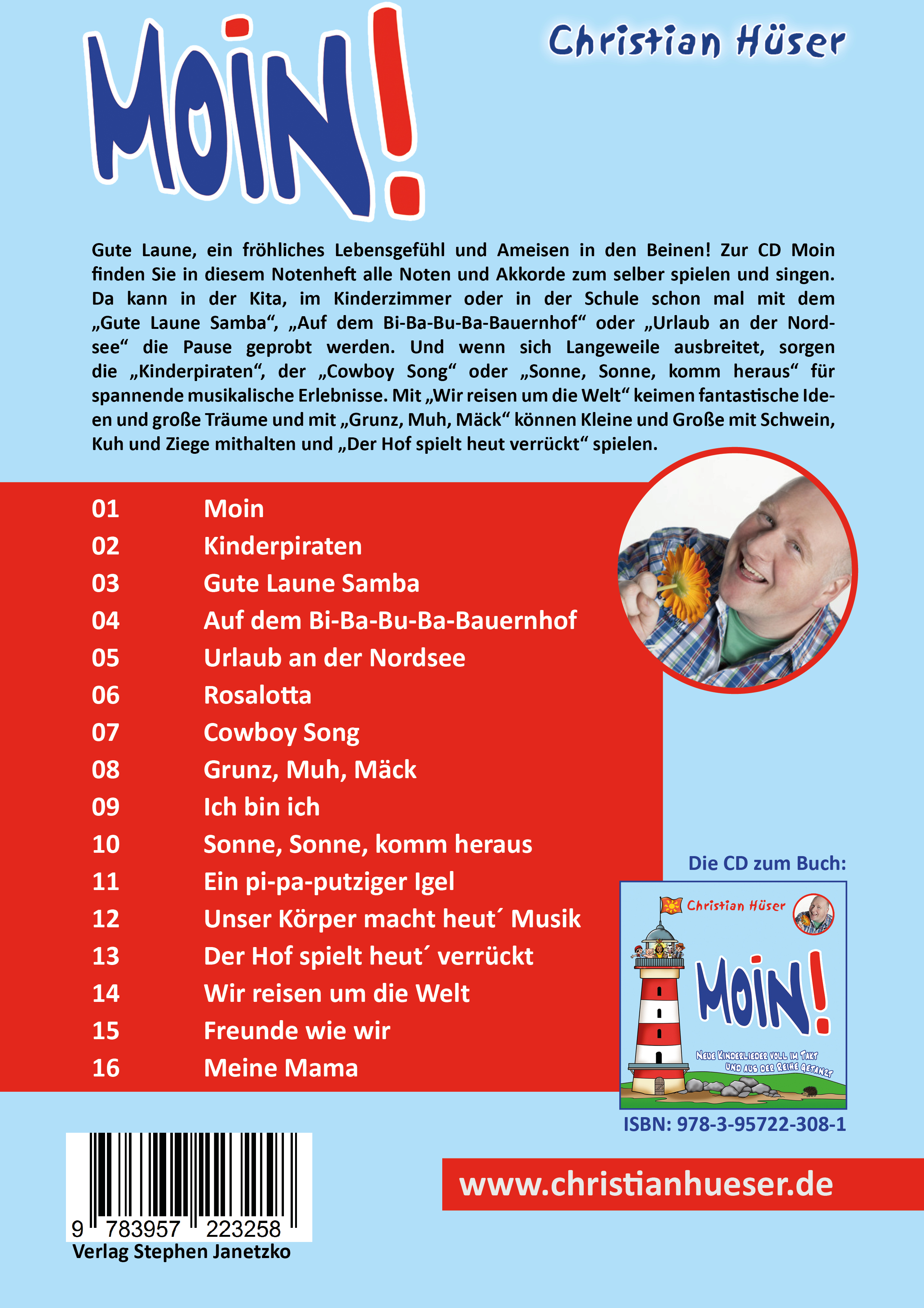 Gute Laune, ein fröhliches Lebensgefühl und Ameisen in den Beinen! Zur CD "Moin" finden Sie in diesem Notenheft alle Noten und Akkorde zum selber Spielen und Singen. Da kann in der Kita, im Kinderzimmer oder in der Schule schon mal mit dem "Gute Laune Samba", "Auf dem Bi-Ba-Bu-Ba-Bauernhof" oder "Urlaub an der Nordsee" die Pause geprobt werden. Und wenn sich Langeweile ausbreitet, sorgen die "Kinderpiraten", der "Cowboy Song" oder "Sonne, Sonne, komm heraus" für spannende musikalische Erlebnisse. Mit "Wir reisen um die Welt" keimen fantastische Ideen und große Träume und mit "Grunz, Muh, Mäck" können Kleine und Große mit Schwein, Kuh und Ziege mithalten und "Der Hof spielt heut verrückt" spielen.