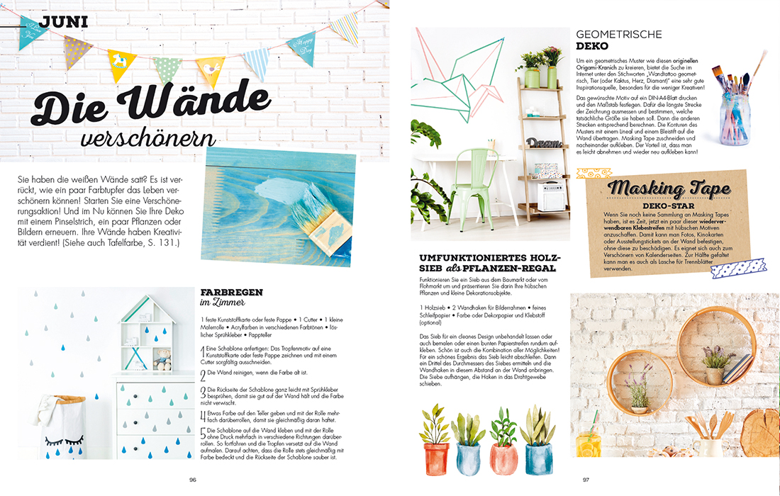 Machen Sie aus Ihren Wochenenden und Ihrer Freizeit besondere Momente der Erholung, des Wohlfühlens und der Entdeckungen! Sie wollten in Ihrer Freizeit schon immer aktiv sein? Jetzt geht es los! Erleben Sie ein Jahr mit vielen tollen Ideen und entdecken Sie Monat für Monat kreative und leckere Dinge, Aktivitäten des Wohlfühlens und Ideen für den Garten Widmen Sie sich Ihrem körperlichen und geistigen Wohl! Abschalten, das Gedächtnis auffrischen, die Wohltat eines Waldbades entdecken und sich ein Wochenende mit Ruhe und Spa gönnen, Yoga und Selbstmassage ausprobieren, selbst Kosmetik herstellen etc. Aktivieren Sie Ihre kreative Ader! Deko für das Haus herstellen, Schmuck basteln, häkeln, ein Bullet Journal anfertigen, Stoff selber färben etc. Entdecken Sie Ihren grünen Daumen! Auf dem Balkon einen kleinen Garten mit duftenden Kräutern und Blumen oder mit Gemüse anlegen, mit Permakultur starten, sich den Zimmerpflanzen widmen etc. Seien Sie umweltbewusst! Reinigungsmittel für das Haus selber machen, das Haus mit wohltuenden Pflanzen schmücken, Vögel in den Garten locken, Kräuter beim Spazierengehen sammeln, Abfälle recyceln etc. Schöne Familienerlebnisse gestalten! Mit den Kindern kochen, mit ihnen zusammen Spiele basteln, einen lustigen Nachmittag oder eine Pyjama-Party für sie organisieren etc.
