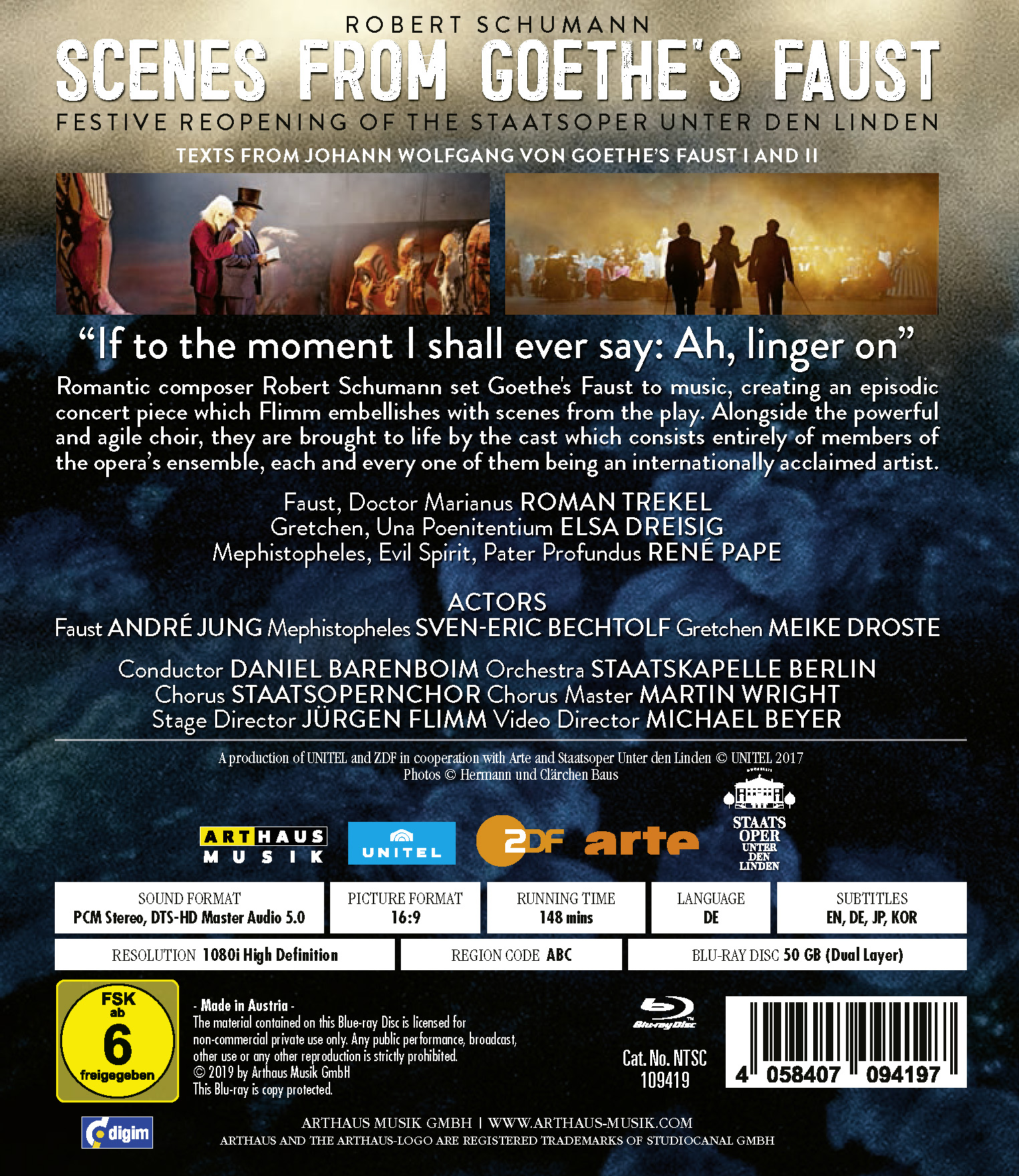 Die Staatsoper Berlin ist wieder an ihren Ursprungsort zurückgekehrt: Unter den Linden! Nach umfangreichen Renovierungsarbeiten wurde sie mit Schumanns Szenen aus Goethes Faust unter der Leitung von Daniel Barenboim wiedereröffnet. Inszeniert von Jürgen Flimm und mit dem Bühnenbild des renommierten deutschen Künstlers Markus Lüpertz verwandelt sich Schumanns Orchesterwerk in ein fesselndes Drama. Im Glanz des renovierten Opernhauses sind Daniel Barenboim und die Staatskapelle Berlin neben den Solisten wie Roman Trekel, Elsa Dreisig und René Pape zu erleben. Neben den Gesangspartien werden die Hauptcharaktere Faust, Gretchen und Mephistopheles von den bekannten Schauspielern André Jung, Meike Droste und Sven-Eric Bechtolf verkörpert.
