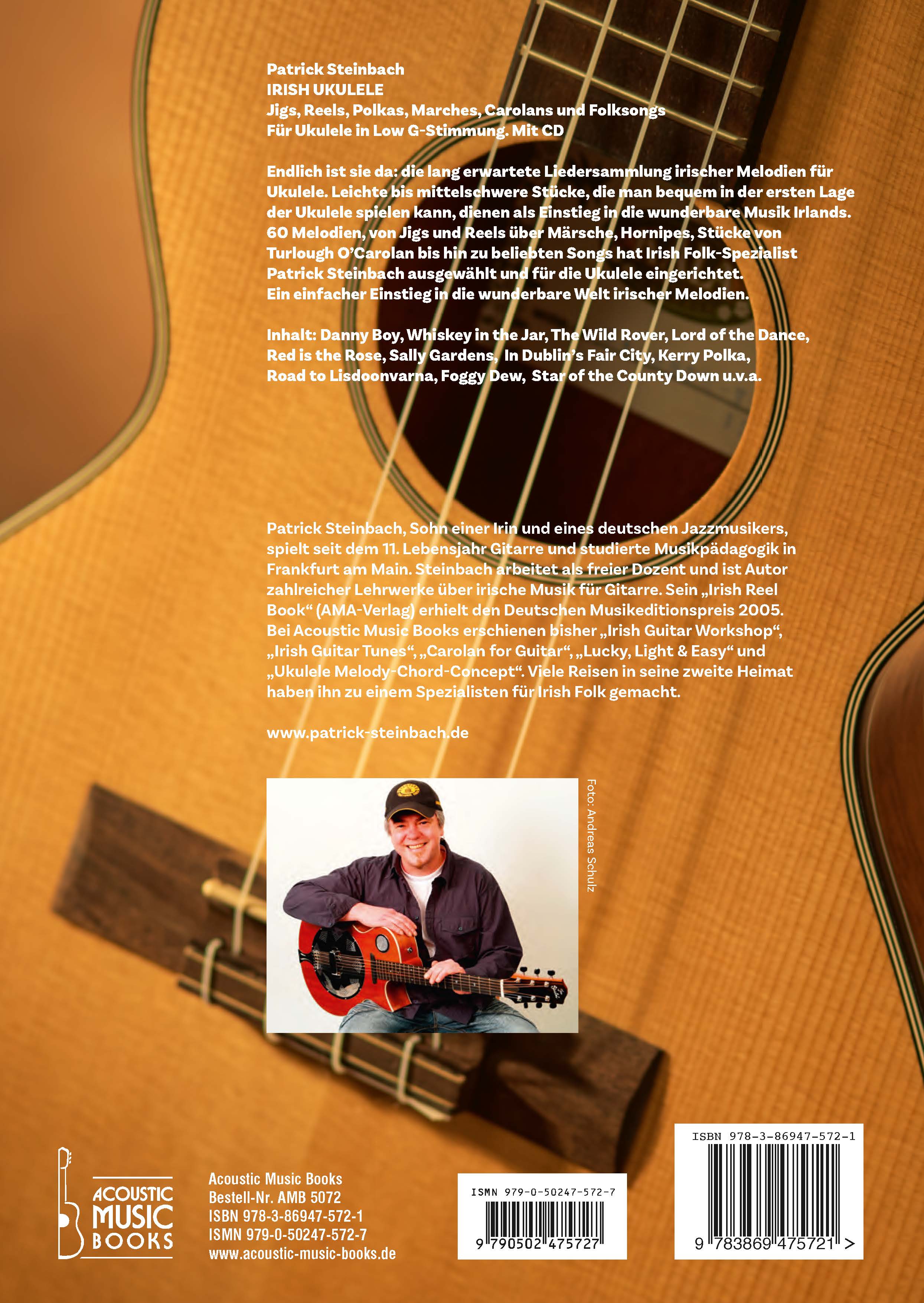 Patrick Steinbach, Sohn einer Irin und eines deutschen Jazzmusikers, spielt seit dem 11. Lebensjahr Gitarre und studierte Musikpädagogik in Frankfurt am Main. Steinbach arbeitet als freier Dozent und ist Autor zahlreicher Lehrwerke über irische Musik für Gitarre. Sein „Irish Reel Book“ (AMA-Verlag) erhielt den Deutschen Musikeditionspreis 2005. Bei Acoustic Music Books erschienen bisher „Irish Guitar Workshop“, „Irish Guitar Tunes“, „Carolan for Guitar“, „Lucky, Light & Easy“ und „Ukulele Melody-Chord-Concept“. Viele Reisen in seine zweite Heimat haben ihn zu einem Spezialisten für Irish Folk gemacht. www.patrick-steinbach.de