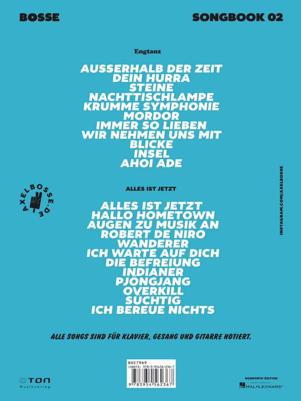 Auf 184 Seiten enthält das Songbook alle 23 Songs der beiden Alben ENGTANZ und ALLES IST JETZT arrangiert für Klavier, Gesang und Gitarre sowie ein Vorwort, Fotos und Liner Notes zu jedem Song.
