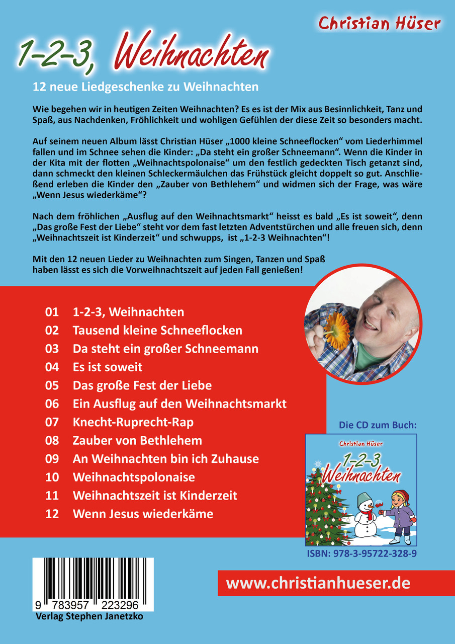 Endlich ist es soweit, das neue Album "1-2-3 Weihnachten" des beliebten Kinderliedermachers Christian Hüser ist da. Der sympathische Sänger aus dem Emsland präsentiert sein neues Kinderliederalbum. 12 schwungvolle, aber auch gefühlvolle Lieder sind auf der CD zu hören - und wie immer darf getanzt, gesungen, gelacht und geträumt werden.