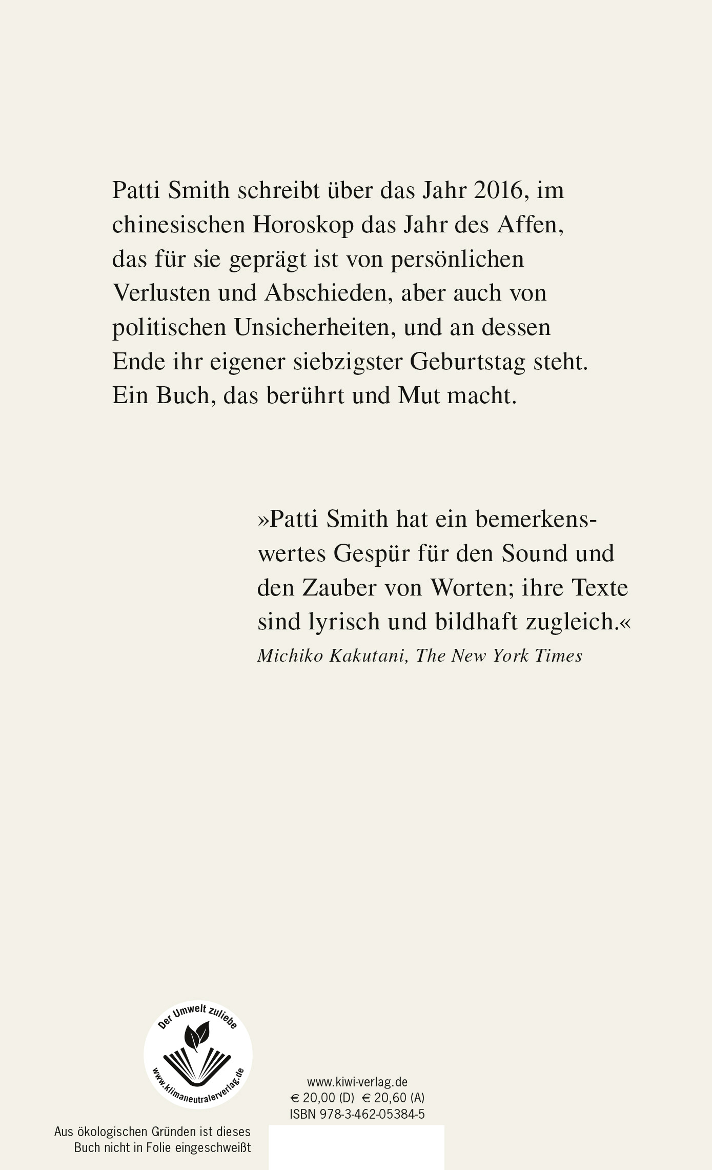 Patti Smith schreibt über das Jahr 2016, im chinesischen Horoskop das Jahr des Affen, das für sie geprägt war von persönlichen Verlusten und Abschieden, aber auch von politischen Unsicherheiten und an dessen Ende ihr eigener siebzigster Geburtstag steht. Eine sehr persönliche und poetische Bestandsaufnahme. Das Jahr 2016 ist ein unruhiges Jahr für Patti Smith, ein Jahr, in dem sich vieles für immer verändert. Sie verliert engste Freunde: den Musiker Sandy Perlman und einen anderen, den damals schon schwerkranken Regisseur und Schriftsteller Sam Shepard, sieht sie in diesem Jahr zum letzten Mal. Er stirbt 2017. Vorher hatte er Patti Smith noch gebeten, ihm bei seinem letzten Buch zu helfen. Auch politisch ist 2016 ein unruhiges Jahr, Donald Trump wird zum Präsidenten gewählt, alte Gewissheiten werden außer Kraft gesetzt. Trotz der Schwere dieser Themensetzung gelingt es Patti Smith immer wieder, durch viele Erinnerungssequenzen, Rückblenden und Verwebungen aus Realität und Imaginiertem eine positive Grundstimmung zu erzeugen. Dies auch, weil sie nicht in der Vergangenheit verharrt, sondern ganz fest in der Gegenwart verankert bleibt. Davon zeugen im Buch die Aufzeichnungen von vielen Gesprächen mit Menschen, denen sie während dieses Jahres auf ihren Reisen begegnet und von denen sie Impulse für ihr eigenes Leben bekommt. Ein »Road-Memoir«, ein Alterswerk im besten Sinne. Ein Blick zurück und nach vorne zugleich.