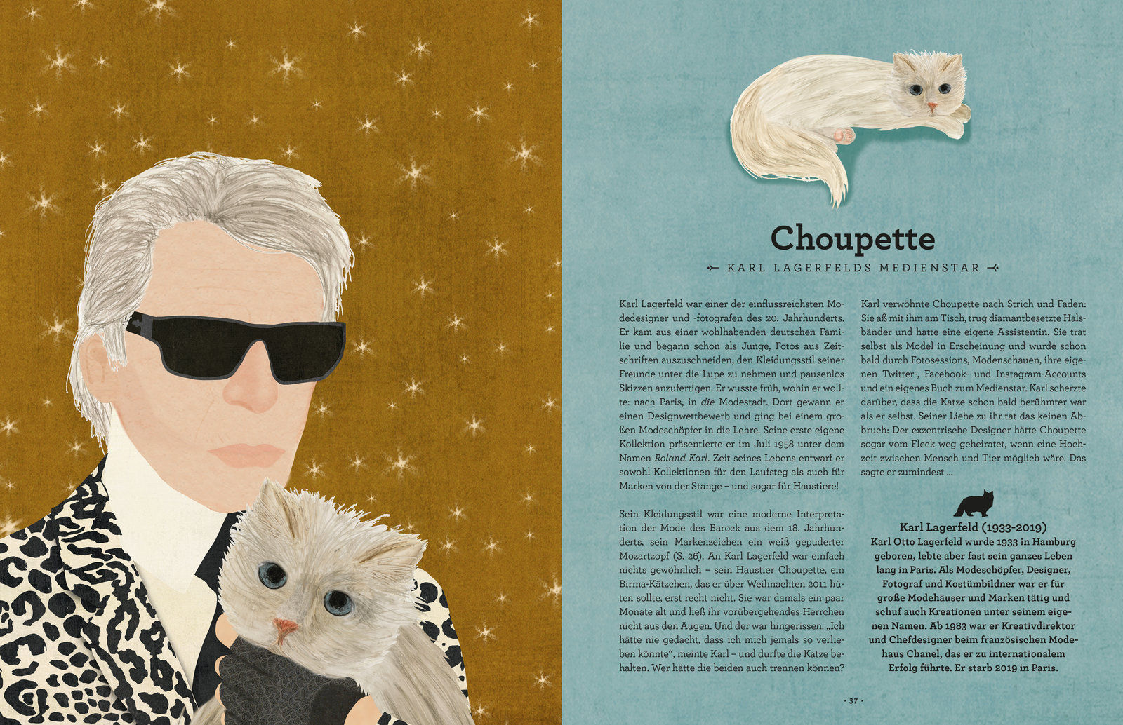 Wir alle kennen Salvador Dalí. Aber kennt ihr auch seinen Ozelot Babou? Dalí nahm seinen kleinen südamerikanischen Leoparden gerne überall hin mit und behauptete, er wäre eine harmlose angemalte Katze. Andy Warhols Dackel Archie badete ebenso wie der Pop-up-Künstler gerne im Scheinwerferlicht der Kameras und der kleine Chow-Chow Jofi half seinem Herrchen Sigmund Freud bei dessen revolutionären Theorien. Jede dieser wunderbar unterhaltsamen Geschichten wird durch Katherine Quinns faszinierende Illustrationen künstlerisch untermalt. Ihre detailreichen Bilder erinnern an Volkskunst und fangen den Humor und die Schärfe dieser faszinierenden Tier-Mensch-Beziehung ein. Zusammen werden diese Geschichten und Illustrationen bleibende Eindrücke bei Kindern hinterlassen und ihnen helfen, Persönlichkeiten aus Kunst, Kultur, Literatur und Wissenschaft kennenzulernen. Ein einzigartiges Bilderbuch über bekannte Persönlichkeiten und ihre tierischen Begleiter für Kinder ab 7 Jahren.Dieses Buch versammelt zwanzig liebevolle Geschichten über die tierischen Freunde berühmter Persönlichkeiten aus der Kunst, Musik, Literatur und Wissenschaft.Granizo - Frida Kahlos zahmes Reh; Archie - Andy Warhols Freund fürs Leben; Katze - Gustav Klimts pelzige Gesellschaft; Pinka - Virginia Wolfs Inspiration; Grip - Charles Dickens' sprechender Rabe; Kaimane in der Badewanne - Dorothy Parkers Krokodile; Babou - Salvador Dalís "angemalte Katze"; Bibo v Albert Einsteins trauriger Papagei; Jofie - Sigmund Freuds Assistentin; Diamond - Isaac Newtons tapsiger Begleiter; Lump - Pablo Picassos Liebling; "Vogel Stahrl" - Wolfgang Amadeus Mozarts gefiedeter Imitator; Snowball - Ernest Hemingways Glückskatze; Bustopher Jones, Mungojerrie, Rumpleteazer - T.S. Eliots "CATS"; Puce - Henri Matisses schwarzer Kater; Pluto & Elia - Lucian Freuds Modelle; Choupette - Karl Lagerfelds Medienstar; Stanley & Boodgie - David Hockneys Dachshunde; Bo & Chia - Georgia O'Keeffes Chow-Chows; Bimbo - Paul Klees weißer Kater.