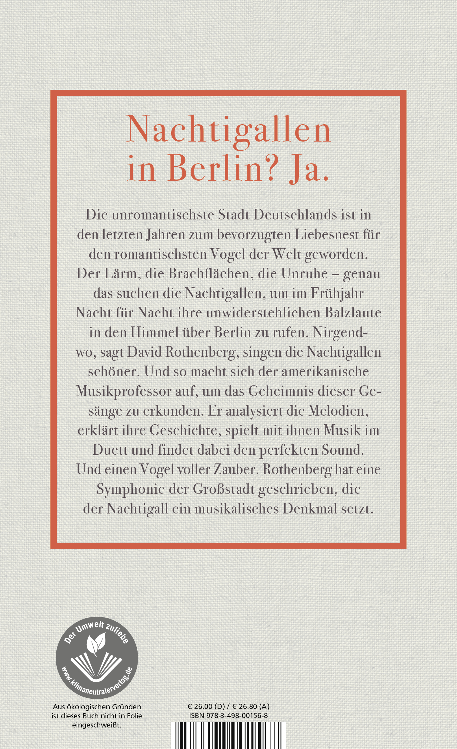 Der amerikanische Musikologe und Musiker Rothenberg, eine Ikone der Experimentalmusikszene weltweit, hat eine Symphonie der Großstadt geschrieben, das der Nachtigall ein musikalisches Denkmal setzt. Rothenberg, der Wissenschaftler, analysiert den Klang der Tiere, der Musiker Rothenberg jammt mit den Vögeln. So wird sein Buch zu einer poetischen Kulturgeschichte der Nachtigall und zur Erforschung der Beziehung von Geräusch und Musik und Poesie.