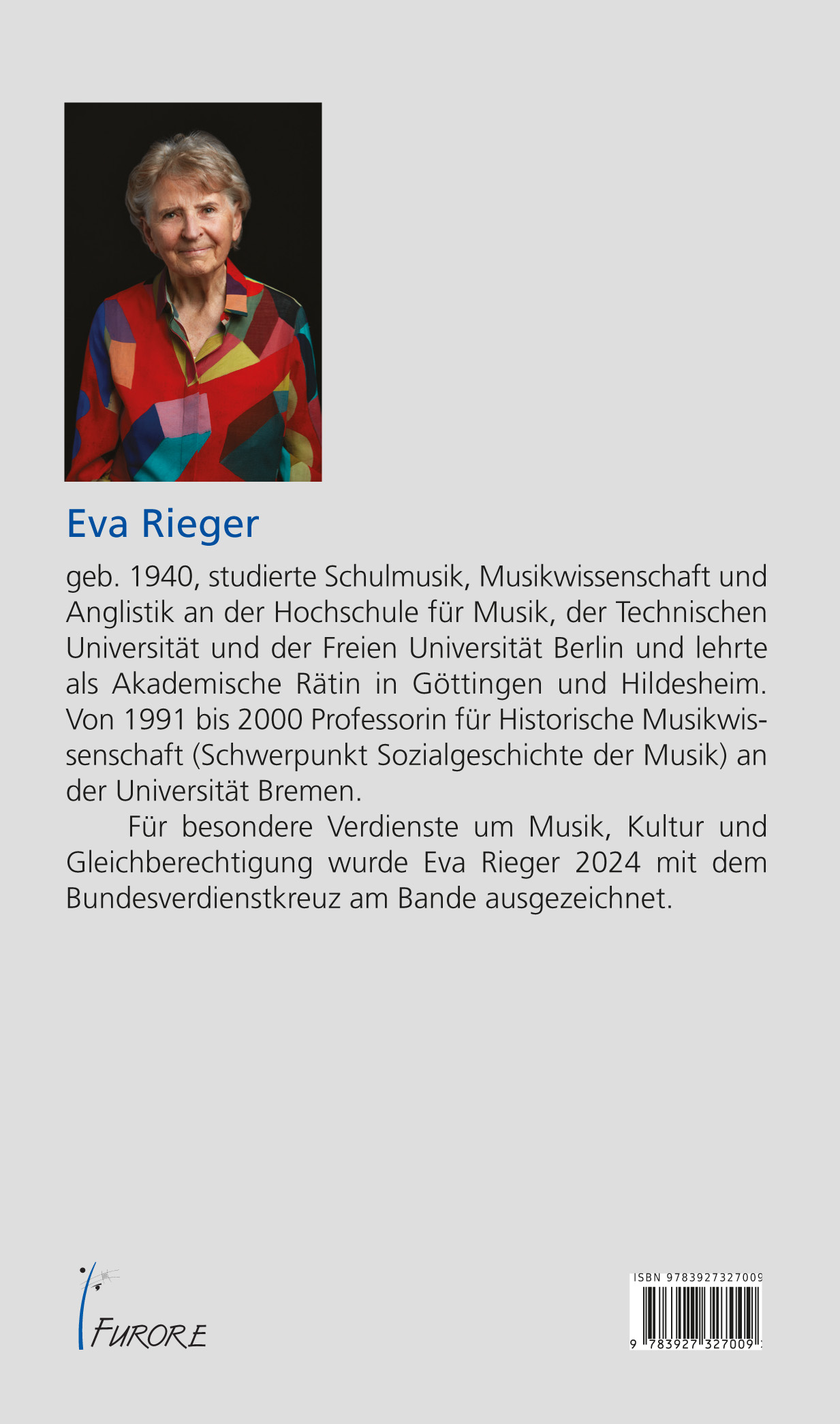 Eva Rieger, geboren 1940 auf der Insel Man, arbeitete sechs Jahre lang beim RIAS in Berlin, studierte dann Musikwissenschaft und Anglistik, promovierte bei Carl Dahlhaus und arbeitete als Akademische Rätin an den Universitäten Göttingen und Hildesheim. Ab 1991 bis zur ihrer Emeretierung Professorin für Musikwissenschaft an der Universität Bremen. Seit den frühen siebziger Jahren in der Frauenbewegung aktiv, war sie weltweit die Erste, die nach Sophie Drinker (1948) die Sozial- und Kulturgeschichte der Frau in der Musikkultur aufarbeitete.