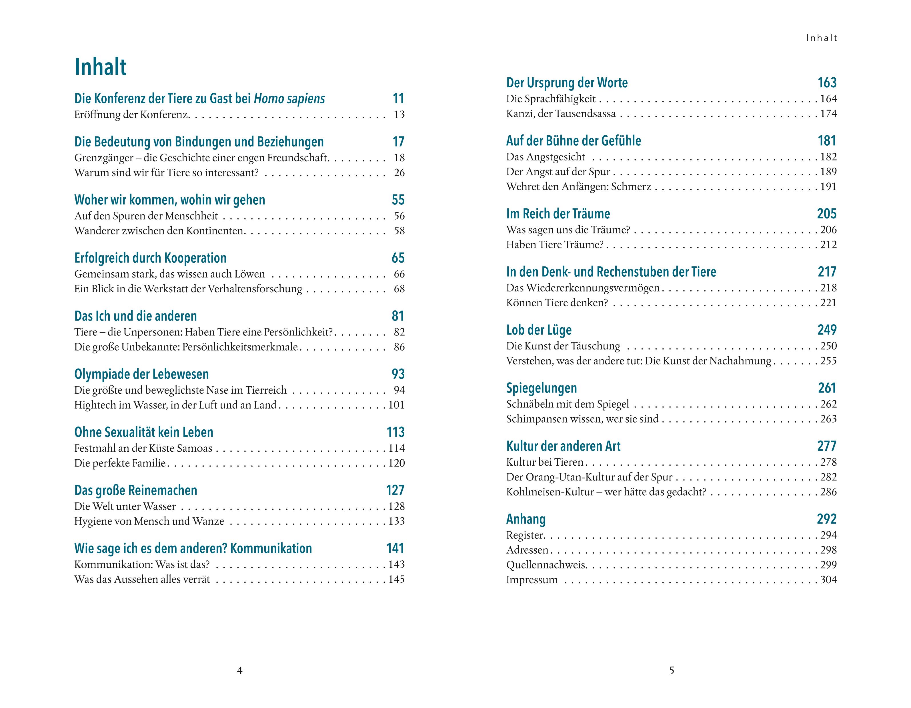 | Schlagworte | Bindungen • Fortpflanzung • Gefühle • Kommunikation • kommunikations-verhalten • Kooperation • Mensch-Tier-Beziehungen • Partner • Partnerschaft • Persönlichkeitsmerkmale • Schlaf • Sexualität • Sprachfertigkeit • spuren der menschheit • Teamarbeit • Tier-Freundschaften • Tier-Haltung • tier-persönlichkeiten • tier-sprache • tier-verhalten • Träume • unterwassserwelt • Verhaltensforschung |