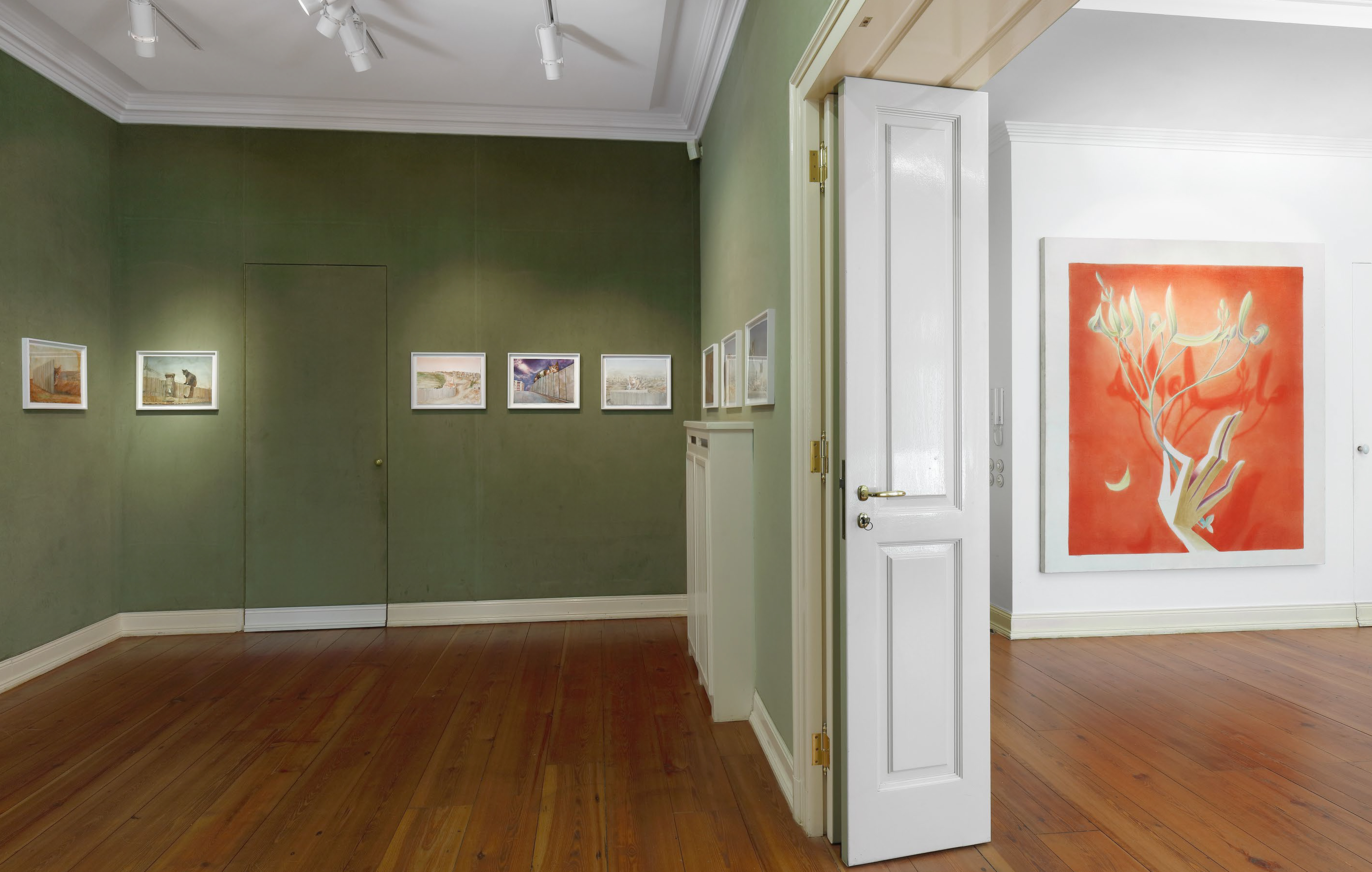Malerei, Zeichnung, Skulptur und Installation umspannen das Werk von Christoph Knecht (geb. 1983 in Karlsruhe, lebt und arbeitet in Düsseldorf). Vielschichtig und disparat sind die Motive seiner Werkgruppen, vorbei scheint die Zeit der Metaerzählungen. Diesem Denken folgt Knecht als Vertreter der Generation der Digital Natives. Die vielschichtige Auswahl von Motiven steht bei Knecht im Sinne eines Erkenntniswillens: der Durchdringung von Zeichen und der Erforschung kultureller Zugehörigkeit und Teilhabe durch die Wiederholung und das Verrücken von Symboliken. Blau bemalte, glasierte Fliesentableaus im Stile der portugiesischen Azulejos zeigen Metallhartschalenkoffer neben altertümlichen Sternenbildern und YouTube-Icons - global zirkulierende Zeichen im 360 Grad gefliesten Wandpanorama. Israelische Beauty-Produkte verschränkt der Künstler in der Serie Yad Chen mit religiösen Sprüchen aus dem Islam und malt diese in arabischer Schrift im Stil des Kubismus auf die Leinwand. Doch nicht nur im Fremden und Fernen findet Knecht Inspiration und Lust an der Umdeutung. Der in Bronze gegossene Döner ist für ihn gleichsam Teil einer deutschen Erzählung wie auch die Radierungen kopulierender Hirsche auf spitzenverzierten Pappdeckeln von Tortenböden.