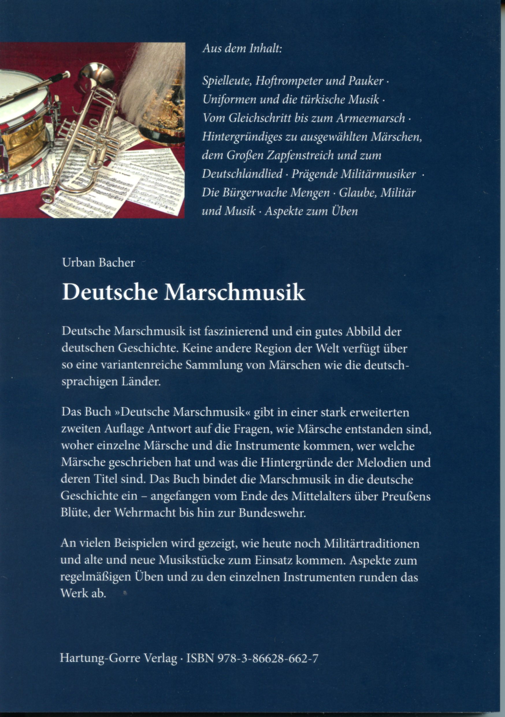 Das Buch »Deutsche Marschmusik« gibt in einer stark erweiterten 2. Auflage Antwort auf die Fragen, wie Märsche entstanden sind, woher einzelne Märsche und die Instrumente kommen, wer welche Märsche geschrieben hat und was die Hintergründe der Melodien und deren Titel sind. Das Buch bindet die Marschmusik in die deutsche Geschichte ein – von den Habsburgern über Preußens Blüte, über die Wehrmacht bis hin zur Bundeswehr. An vielen Beispielen wird gezeigt, wie heute noch Militärtraditionen und alte und neue Musikstücke zum Einsatz kommen. Aspekte zum regelmäßigen Üben und zu den einzelnen Instrumenten runden das Werk ab.