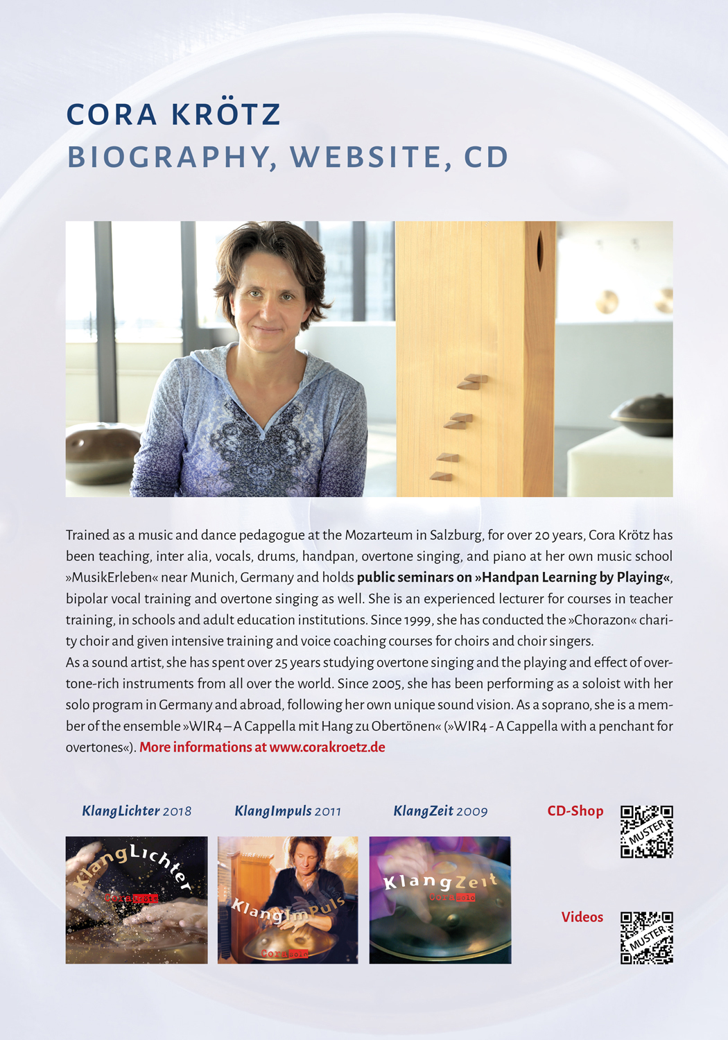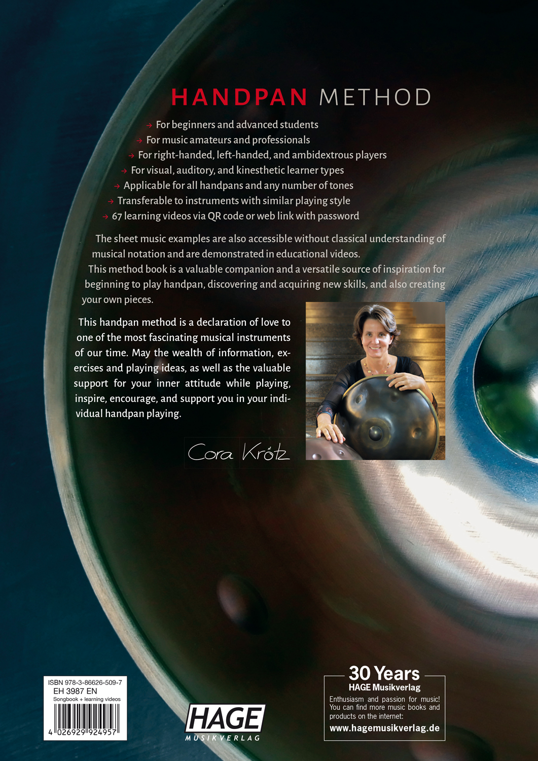 For beginners and advanced students For music amateurs and professionals For right-handed, let-handed, and ambidextrous players For visual, auditory, and kinesthetic learner types Applicable for all handpans and any number of tones Transferable to instruments with similar playing style 67 learning videos via QR code or web link with password