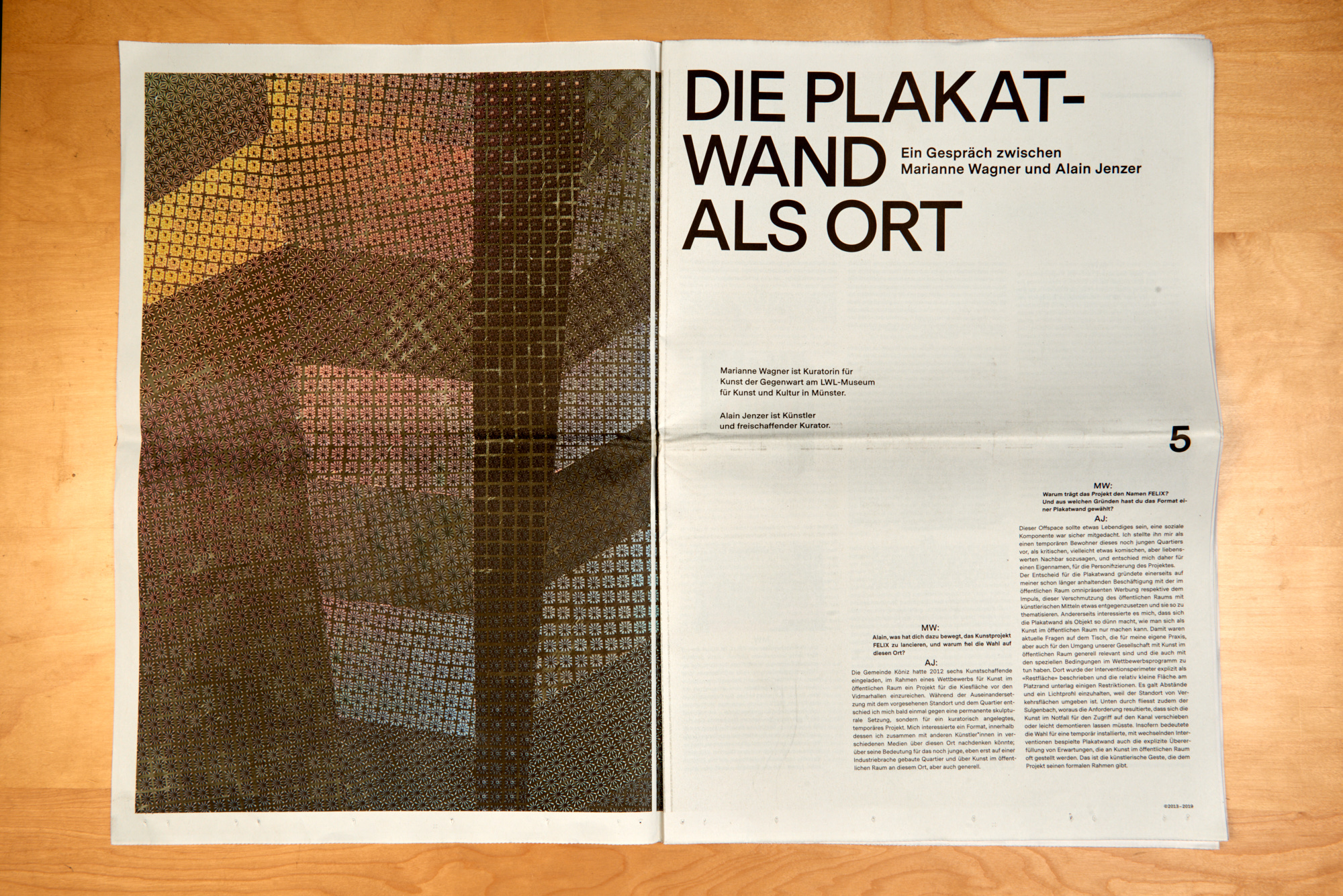 Felix war eine Plakatwand. Felix war im Quartier Weis-senstein/ Neumatt, auf dem Platz vor den Vidmar-hallen zuhause. Felix war ein Projekt des Künstlers Alain Jenzer. Felix war ein Offspace, ein nicht kommerzieller Kunstort. Mit den Mitteln der Kunst reflektierte Felix während fünf Jahren sich selbst und sein Quartier. Und nach 21 Ausstellungen ist Felix nun eine Zeitung geworden, mit 40 Seiten. Darin bekommen alle Künstlerinnen und Künstler, die mit und am Felix gearbeitet haben, ihren Platz und ihren Text. Und, sehr wichtig: die Kuratorin Marianne Wagner spricht mit Alain Jenzer über Felix.