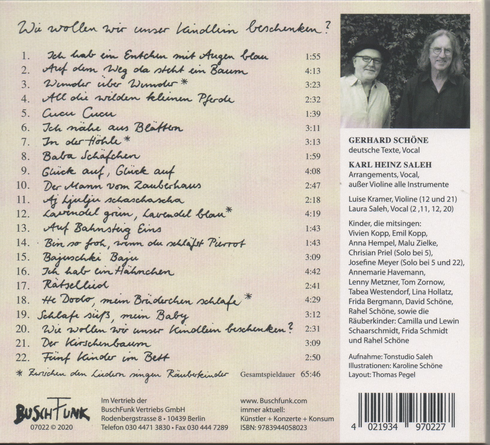 Einige Schlaf und Wiegenlieder bereicherten bereits viele Liederabende (und natürlich -nachmittage) und führten zu reichlich Nachfrage. Gemeinsam mit Karl Heinz Saleh, der auch bei der CD mit Kindergedichten oder bei "Böses Baby Kitty Schmidt" für die musikalische Seite Verantwortung trug, hat Schöne Schlaf- und Wiegenlieder aus aller Welt auf bewährte Weise gesammelt und umgedichtet. Randvoll mit witzigen, zuweilen traurigen, immer zärtlichen Liedern. In Booklets geblättert: Stell dir vor, sechs Mal in meinem Leben durfte ich Papa werden! Nun bin ich schon ziemlich alt und denke wehmütig an die Nächte zurück, als unsere Babys nachts herumgetragen werden wollten und ich endlich zeigen konnte, dass ein Papa auch zu etwas taugt, selbst wenn er sein Baby nicht stillen kann. Dann bin ich mitten in der Nacht in der Wohnung kilometerweit immerzu im Kreis gelaufen und habe das Baby beruhigt. Manchmal habe ich dabei etwas erfunden, das dem Gesang von Indianern glich: "Hejaheja hojahoja". Dabei schliefen die Babys oft besser ein, als bei "Schlaf, Kindchen, schlaf!" Später, wenn aus dem Baby ein kleines Kind wurde, wollte es trotzdem ganz gern etwas hören, das konnte etwas Witziges oder Trauriges oder Zärtliches sein, Hauptsache nicht langweilig. Dann habe ich in meine Schlaflieder-aus-aller-Welt-Schatzkiste geguckt und habe ein Lied heraus geholt. Das musste ich nur noch in die eigene Sprache umdichten und schon konnte ich es singen. Unterdessen geht ein Kind nach dem anderen aus dem Haus. Die Schlaflieder aber möchten auf keinen Fall in der Kiste vergammeln. Andere Papas und Mamas, Omas und Opas, Onkel und Tanten sollen sie jetzt singen. Mein langjähriger Musikerfreund Karl Heinz, ebenfalls ein erfahrener Papa, hat für alle Lieder ein passendes musikalisches Kleid geschneidert und sämtliche Instrumente gespielt (bis auf die Geige, die hat seine große Tochter gespielt)... (Gerhard Schöne)