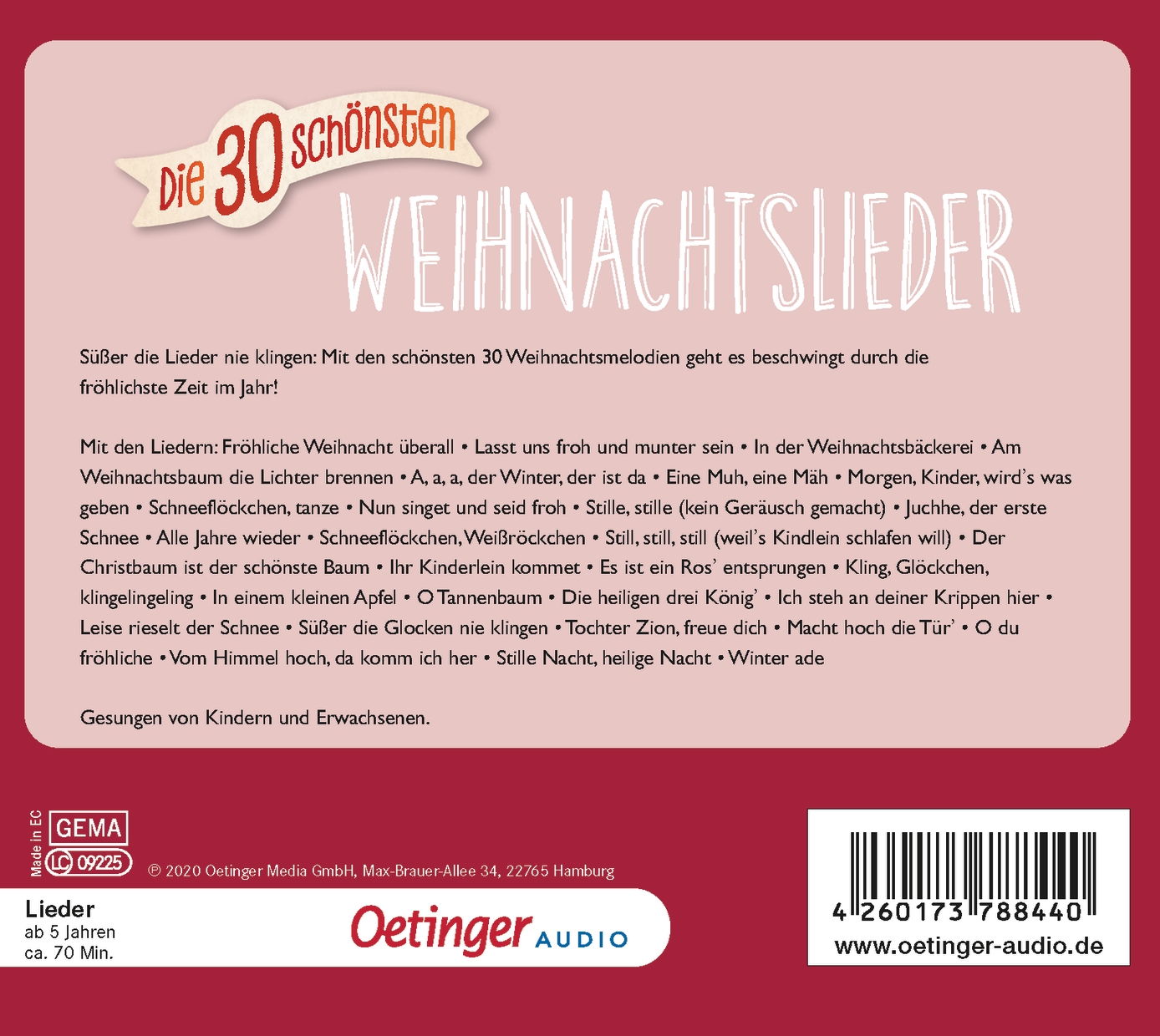 lt;p>Süßer die Lieder nie klingen: Nach den 30 schönsten Zähl-, Tier-, Schlaf-, Geburtstags- und Spiel- und Bewegungsliedern ist nun endlich Weihnachten. Natürlich mit den schönsten, beliebtesten Weihnachtssongs zum Mitsingen, von Lasst uns froh und munter sein bis Stille Nacht, heilige Nacht.