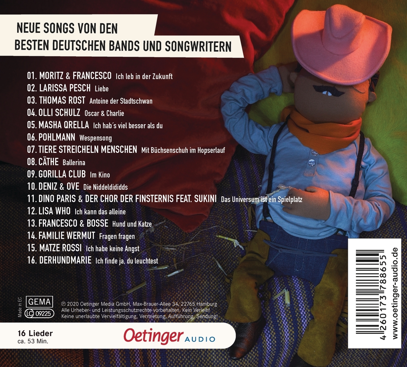 | Schlagworte | 75 Jahre Oetinger Fantastische Geschichten • Cool • Deutschsprachige Künstler • Familie • Indie-Pop • Indie-Rock • Jungen • Kinderalltag • Kinderbeschäftigung • Kinderbuch ab 4 • Kindergartenlieder • Kinderlieder • Kindermusik • Kinderparty • Lieder • Mädchen • Mitsingen • Modern • Musik • Musik für die ganze Familie • Popmusik • Rock • Singen • Singer-Songwriter • Tanzen • Unter meinem Bett |