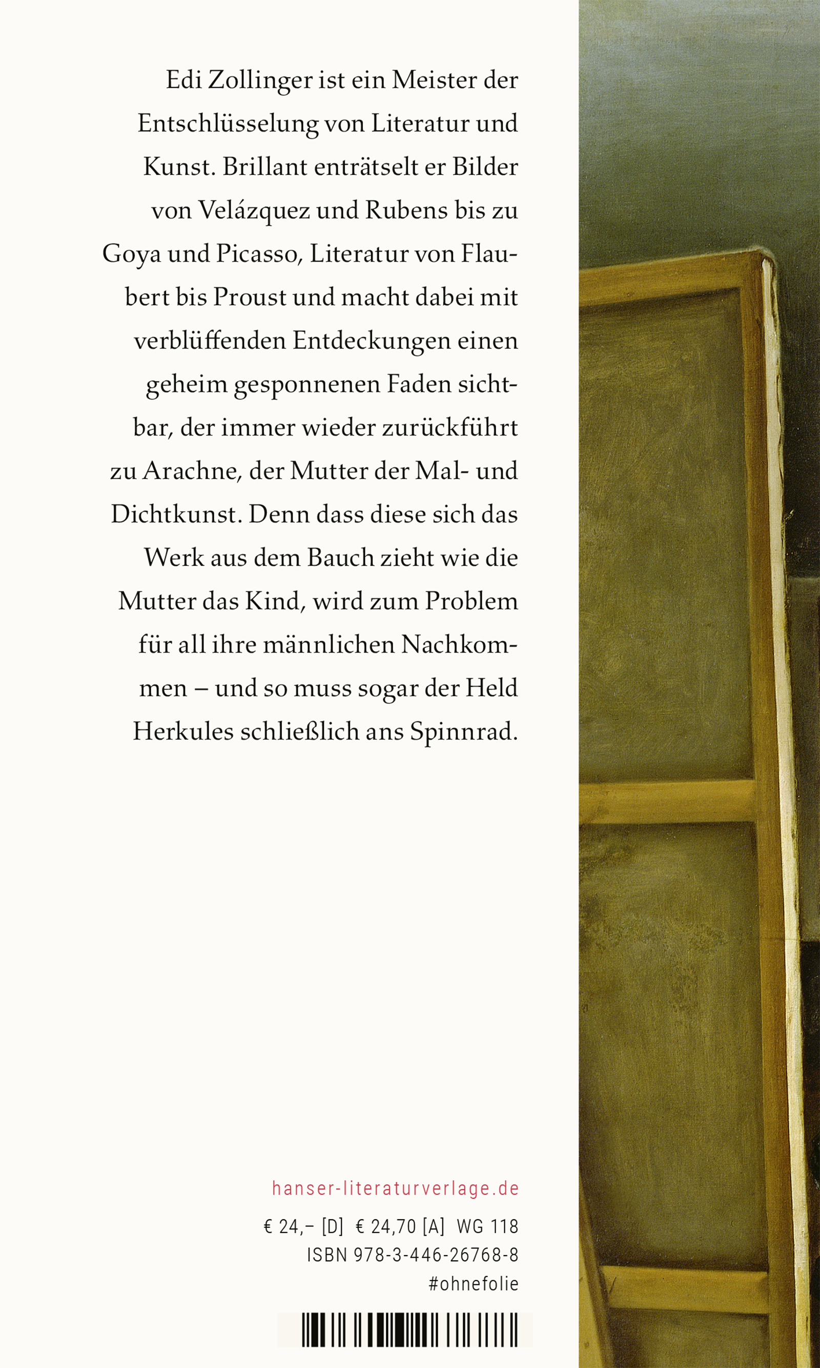 Edi Zollinger ist ein Meister der Entschlüsselung von Literatur und Kunst. Brillant enträtselt er Bilder von Velázquez und Rubens bis zu Goya und Picasso, macht dabei mit verblüffenden Entdeckungen einen geheim gesponnenen Faden sichtbar, der immer wieder zurückführt zu Arachne, der Mutter der Mal- und Dichtkunst. Denn dass diese sich das Werk aus dem Bauch zieht wie die Mutter das Kind, wird zum Problem für all ihre männlichen Nachkommen - und so muss sogar der Held Herkules schließlich ans Spinnrad! Eine inspirierende Zeitreise für alle Liebhaber von Kunst und Literatur, ein detektivischer Blick auf Bilder und Bücher, die man zu kennen glaubte.