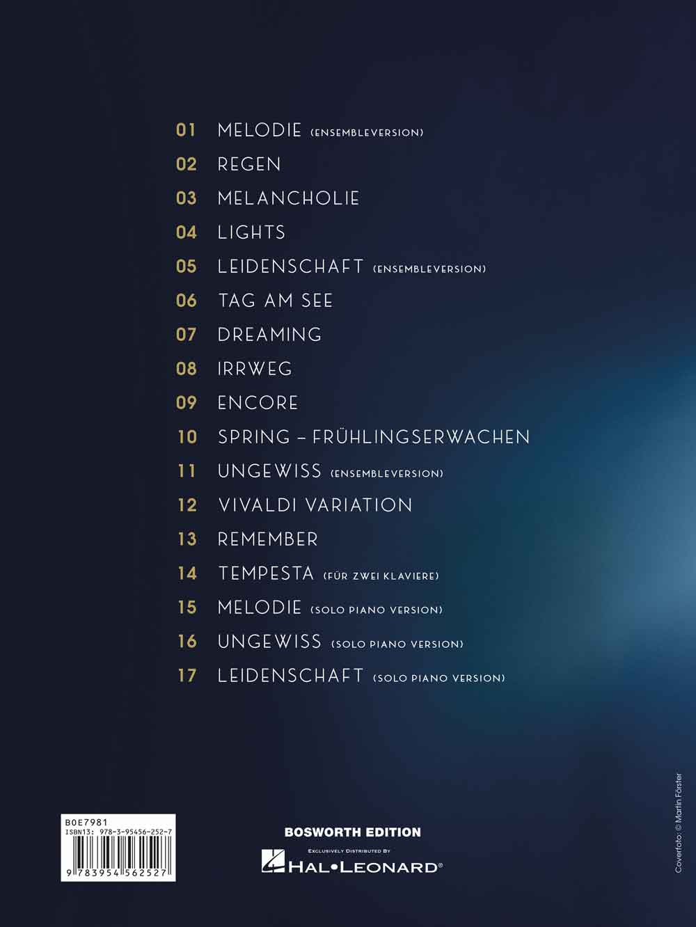 Vierzehn dieser komponierten Episoden finden sich auf „Episodes“. Zu drei Klavierstücken in der Ensembleversion gibt es zusätzlich je eine Version für Solo Piano. Mit insgesamt 17 Stücken für Klavier und ausgewählten Fotografien ist das vorliegende Notenbuch erneut eine wunderbare Ergänzung zum Album „Episodes", das am 8. Mai von Sony Classical veröffentlicht wird.