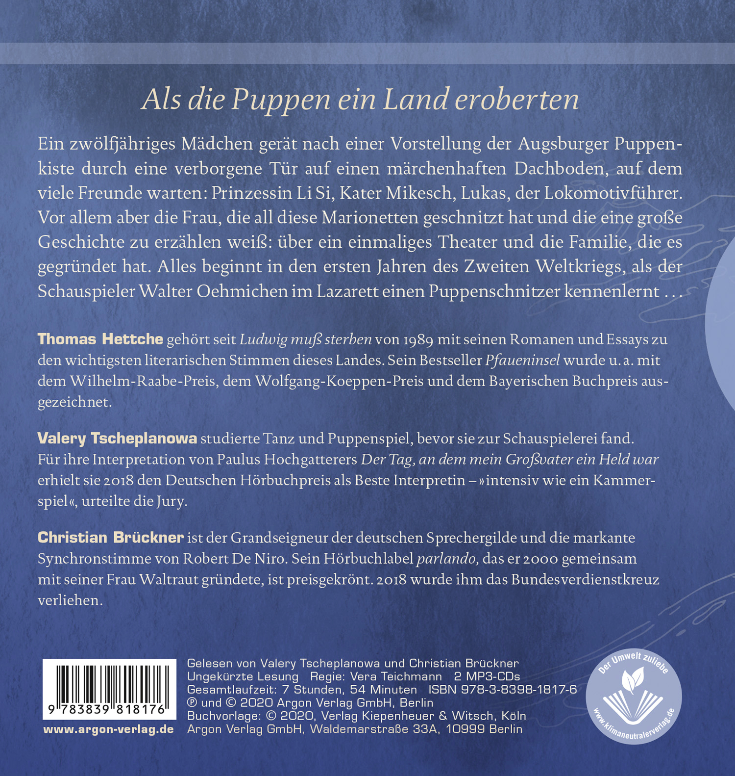 | Schlagworte | Augsburg • Christian Brückner • Christian Brückner • Familiengeschichte • Familienunternehmen • Fernsehgeschichte • Jim Knopf • Krieg • Marionetten • Oehmichen • Prinzessin Li Si • Puppentheater • Theater • Urmel • Valerie Tscheplanowa • Zweiter Weltkrieg |