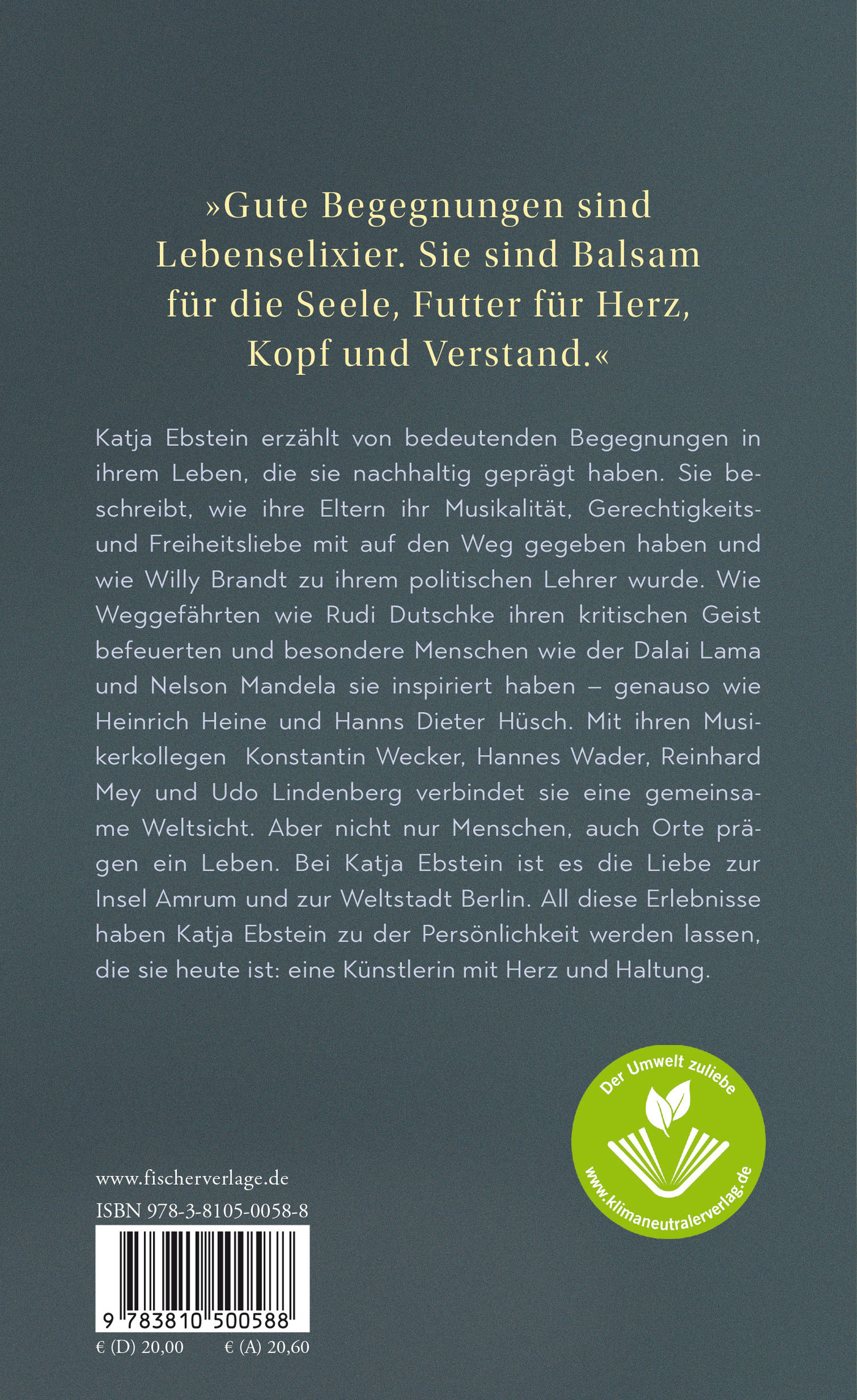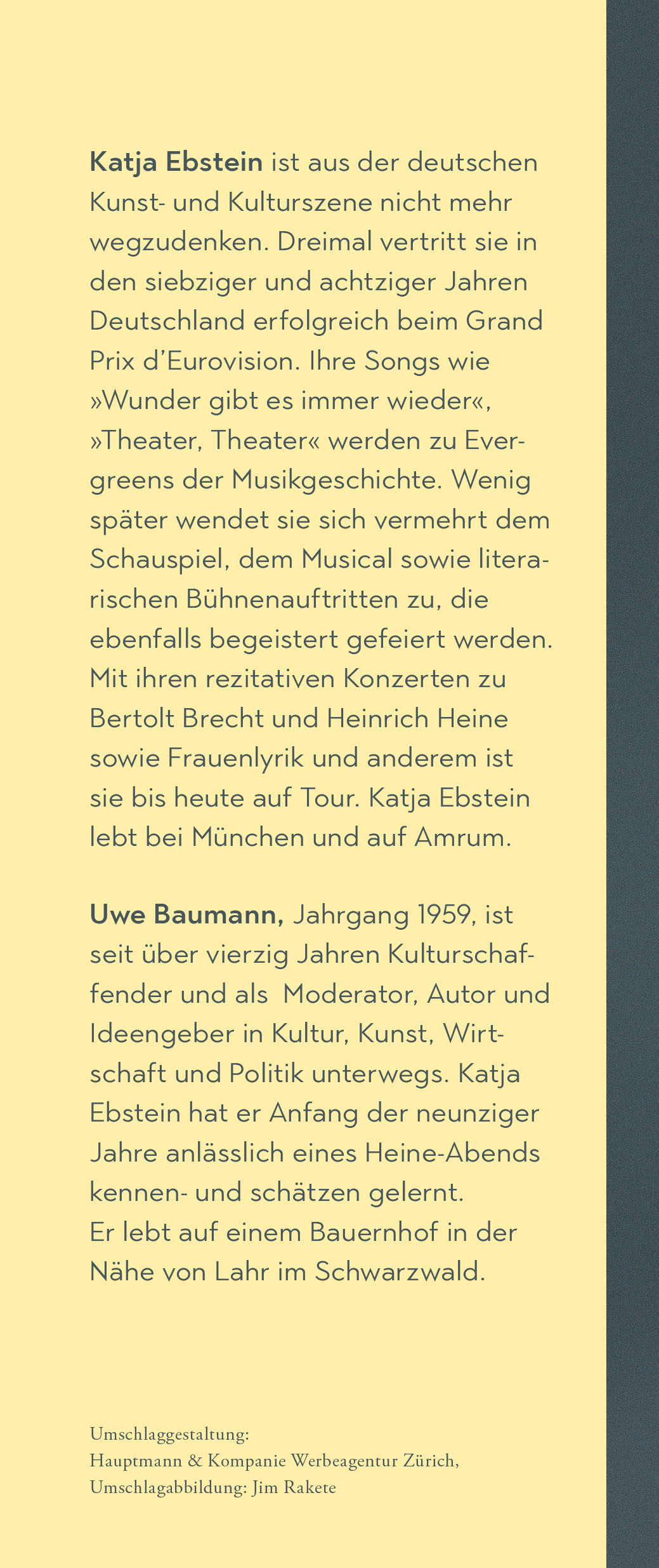 Katja Ebstein ist aus der deutschen Kunst- und Kulturszene nicht mehr wegzudenken. Dreimal vertritt sie in den siebziger und achtziger Jahren Deutschland erfolgreich beim Grand Prix d`Eurovision. Ihre Hits wie „Wunder gibt es immer wieder“, „Theater, Theater“ oder „Abschied ist ein bisschen wie Sterben“ werden zu Evergreens der Musikgeschichte. Wenig später wendet sie sich vermehrt dem Schauspiel, dem Musical sowie literarischen Bühnenauftritten zu, die ebenfalls begeistert gefeiert werden. Mit ihren mit rezitativen Konzerten zu Bertolt Brecht und Heinrich Heine ist sie seit 1975 bis heute auf Tour. Katja Ebstein lebt bei München und auf Amrum.