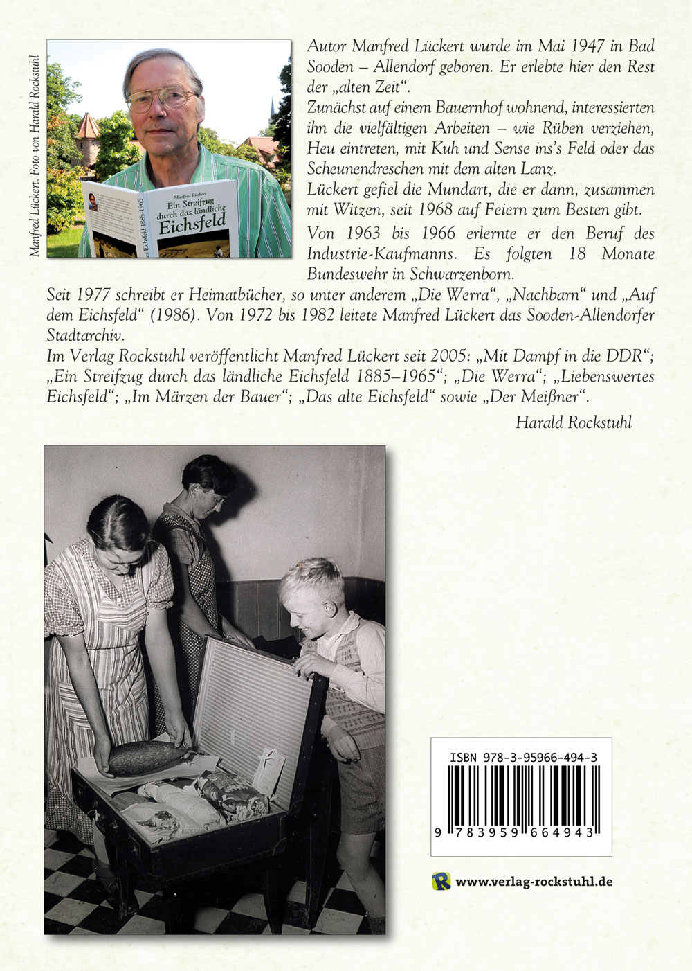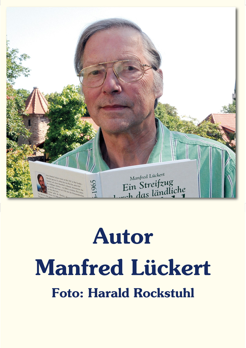 Autor Manfred Lückert wurde im Mai 1947 in Bad Sooden - Allendorf geboren. Er erlebte hier den Rest der "alten Zeit".Zunächst auf einem Bauernhof wohnend, interessierten ihn die vielfältigen Arbeiten - wie Rüben verziehen, Heu eintreten, mit Kuh und Sense ins's Feld oder das Scheunendreschen mit dem alten Lanz.Lückert gefiel die Mundart, die er dann, zusammen mit Witzen, seit 1968 auf Feiern zum Besten gibt. Von 1963 bis 1966 erlernte er den Beruf des Industrie-Kaufmanns. Es folgten 18 Monate Bundeswehr in Schwarzenborn.Seit 1977 schreibt er Heimatbücher, so unter anderem "Die Werra", "Nachbarn" und "Auf dem Eichsfeld" (1986). Von 1972 bis 1982 leitete Manfred Lückert das Sooden-Allendorfer Stadtarchiv. Im Verlag Rockstuhl veröffentlicht Manfred Lückert seit 2005: "Mit Dampf in die DDR" (2005); "Ein Streifzug durch das ländliche Eichsfeld 1885-1965" (2005/2009); "Die Werra" (2006/2007/2011); "Liebenswertes Eichsfeld" (2008/2009) und "Im Märzen der Bauer" (2009).