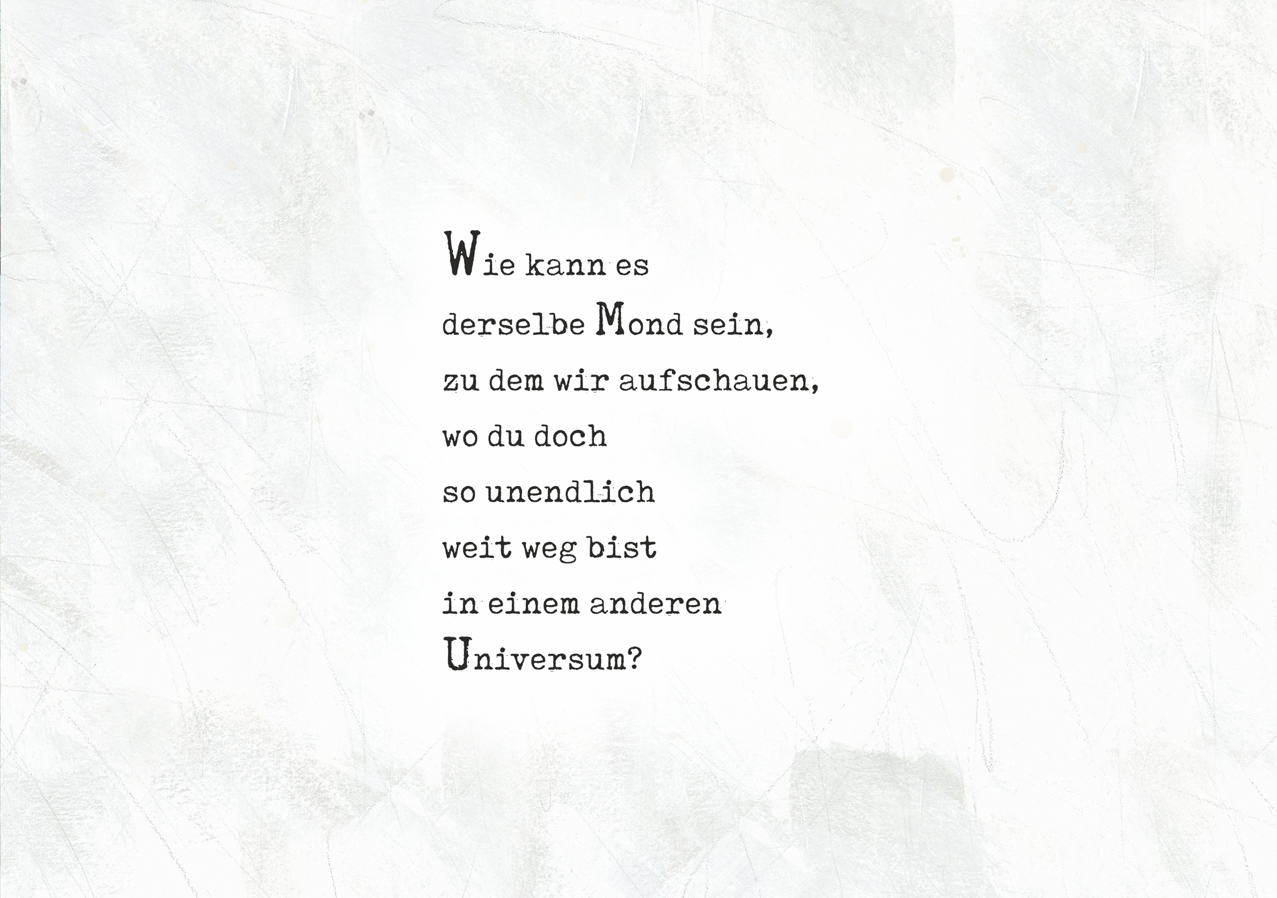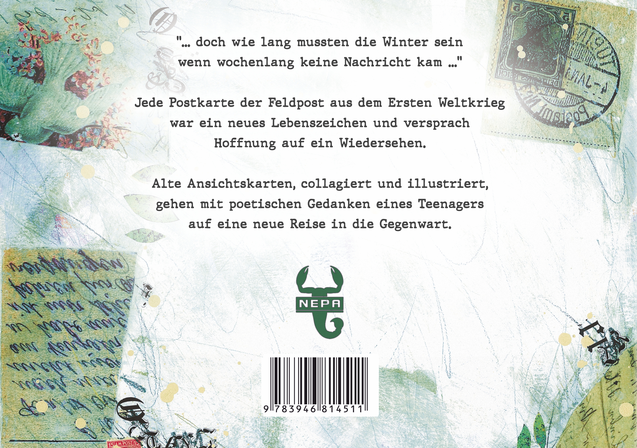 " ... doch wie lang mussten die Winter sein, wenn wochenlang keine Nachricht kam ... " Jede Postkarte der Feldpost aus dem Ersten Weltkrieg war ein neues Lebenszeichen und versprach Hoffnung auf ein Wiedersehen.Alte Ansichtskarten, collagiert und illustriert, gehen mit poetischen Gedanken eines Teenagers auf eine neue Reise in die Gegenwart