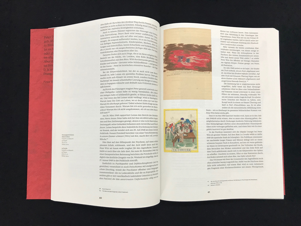 Seine Zeichnungen tragen Titel wie Der Drohfinger Gottes oder Die Züchtigung, Die Todestreppe oder Wie Du mir – so ich Dir. Angst und Gewalt waren von früh an die Begleiter von Peter Wirz, geboren 1915 in Zürich als Sohn des nachmals berühmten Neuguineaforschers Paul Wirz. Von pietistischen Basler Tanten aufgezogen, wegen «Abnormität» in Heime und auf Bauernhöfe abgeschoben, als «Psychopath» entmündigt und schliesslich kastriert, fristete er das unscheinbare Leben eines Gärtnergehilfen und verstarb 2000 in Basel. Ab den 1940er-Jahren schuf er als Autodidakt im Verborgenen sein künstlerisches Werk: rund 700 Farbstiftzeichnungen im A4-Format mitsamt erläuternden Texten. Er erfand einen eigenen, aus der christlich-abendländischen Heraldik abgeleiteten Stil und gestaltete insbesondere zwei Themen mit dem Körper als Zentrum: Liebe, die er nie kennenlernte, und Bestrafung, bei der er sich auskannte. Das wundersame, Schönheit und Schrecken vereinende Werk wäre unentdeckt geblieben, hätte es nicht der Basler Künstler Dadi Wirz, sein Halbbruder, seit den 1970er-Jahren gesammelt und vereinzelt in Gruppenausstellungen von Art Brut untergebracht.