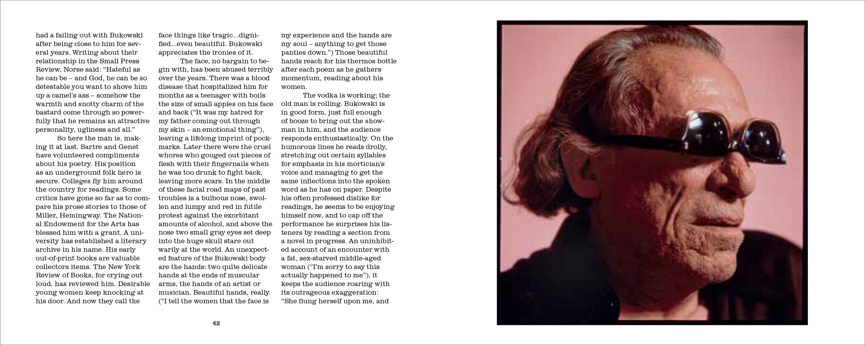 Dieses Gesicht! schreibt Glenn Esterly in seinem im Band enthaltenen Essay The Pock-marked Poetry of Charles Bukowski. In Bukowskis Look konzentriert sich alles, was an dem Jahrhundertautor so faszinierend ist. Dies zeigen eindrucksvoll die großteils bislang unpublizierten Fotografien von Abe Frajndlich. In Farbe und in Schwarz/Weiß porträtierte er Bukowski und fand dessen Vertrauen, so dass er schließlich sogar zur Hochzeit von Bukowski und Linda Lee Beighle eingeladen wurde. Die Publikation erzählt die Geschichte dieser Zusammentreffen, reproduziert die Porträt-Serien und gipfelt in den Aufnahmen der Hochzeit.