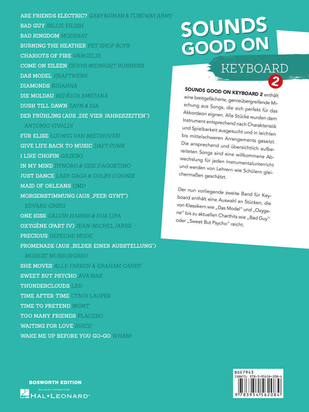 Der nun vorliegende zweite Band für Keyboard enthält eine Auswahl an Stücken, die von Klassikern wie „Das Model“ und „Oxygene“ bis zu aktuellen Charthits wie „Bad Guy“ oder „Sweet But Psycho“ reicht.