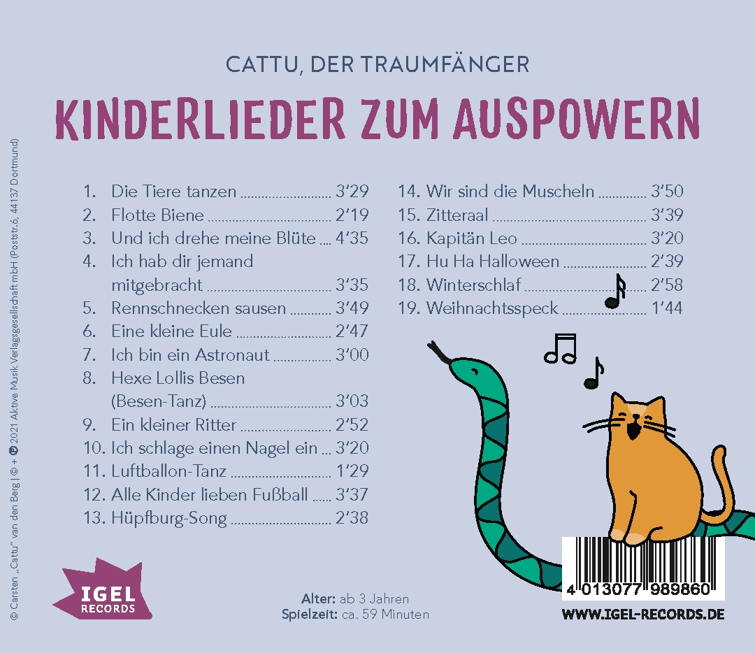 Cattu, der Traumfänger, bringt jedes Kind zum Hüpfen, Toben und Tanzen. Ob fangen spielen mit der flotten Biene und dem flinken Eichhörnchen oder als Astronaut durch das All sausen - diese Songs bringen Spaß und Bewegung ins Kinderzimmer.