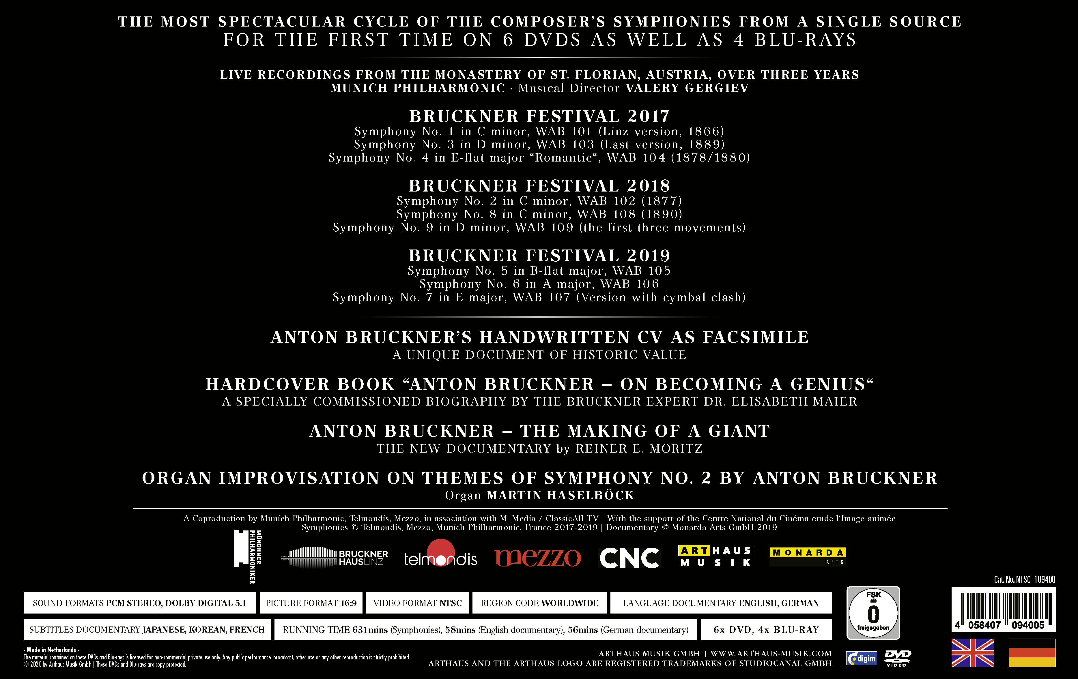 Live recording from Monastery of St. Florian, Linz, Sept.2017, Sept. 2018 & Sept 2019The Munich Philharmonic and Valery Gergiev present the most spectacular and ambitious cycle of Bruckner's Symphonies. All the performances take place in the Monastery of St Florian in Linz, a venue inextricably linked to the composer and hisfinal resting place.Bruckner Festival 2017 Symphonies Nos 1, 3 & 4Bruckner Festival 2018 Symphonies Nos 2, 8 & 9Bruckner Festival 2019 Symphonies Nos 5, 6 & 7Including new filmed documentary "Anton Bruckner - The Making of a Giant" directed by Reiner E. Moritz."Anton Bruckner - The Making of a Giant" is the first in-depth documentary about a composer who was long time underestimated by his contemporaries and only found recognition after his death. In the meantime, the Upper Austrian composer has become one of the most pioneering composers who significantly influenced the history of music until the 20th century. Director Reiner E. Moritz searches for traces on the most important places in Bruckner's life and deals with both the symphonic work and the outstanding organ works. Through the use of interviews with scientists, organists and conductors he retraces the life of Bruckner who was a genius of tones.