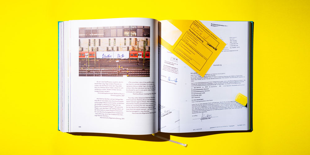 Neun Jahre nach ihrem legendären Buch INTERNATIONAL TOPSPRAYER, das längst vergriffen und mittlerweile für hunderte Euro gehandelt wird, kommt aus dem Hause MOSES & TAPS ein doppelt so dicker Backstein aus Papier: GRAFFITI AVANTGARDE gibt auf 544 Seiten mit über 2000 Fotos in zehn Kapiteln und einer Vielzahl an spannenden und hintergründigen Texten einen tiefen Einblick in MOSES & TAPS breites Schaffen als Graffiti-Künstler seit 2011. Das Werk zeigt, wie ihnen der Spagat zwischen Trainbombing und dem Dasein als akzeptierte Künstler gelungen ist und erklärt, warum diese beiden Welten kein Gegensatzpaar sein müssen.Den Anfang der Monografie macht ein Interview von MOSES & TAPS durch die Kriminologin Ike, in dem der Frage nachgegangen wird, was die Graffiti Avantgarde eigentlich ausmacht, wer sie ist, welche Ziele sie hat und was sie antreibt. Dem TOPSPRAYER-Kapitel, in welchem uns MOSES & TAPS über diverse Zwischenstationen auf Zügen von Russland in die USA führen, folgt das SPLASH-Kapitel, in dem man lernt, auf welchen Orten und Unorten man als Writer bunte Spuren mit Spraydosen hinterlassen kann ohne ein Fatcap und Buchstaben benutzen zu müssen.Anschliessend wird das Zepter an ALIAS übergeben, dessen vorgeblich 1001 Züge in 999 Tagen auf 176 Seiten durch seine Storys und die Actionfotos von Edward Nightingale abgerundet werden. In SCRATCHITI zeigt MOSES, warum er Glasscheiben nur bemalt um sie zu säubern, wie er sie aus dem Yard ins Museum und wieder zurückbringt und warum er Micky Maus hasst. Im Kapitel CORPORATE IDENTITY dechiffriert Robert Kaltenhäuser dann, wie sich über MOSES & TAPS CI-Codes alle Kapitel verbinden lassen, warum gelb-blau besser als Banksy funktioniert und was hinter steckt.Mit IMAGE OF GRAFFITI macht TAPS deutlich, warum Graffiti illegal sein muss und wie man trotzdem ein Abbild davon auf Leinwänden erschaffen kann. Während sich das Kapitel SCHÖPFERISCHE ZERSTÖRUNG mit der Vielschichtigkeit von MOSES & TAPS´ Arbeiten auseinandersetzt, die sich in collagenartigen Bildern und Installationen ausdrücken, widmet sich der Teil KONZEPT-VANDALISMUS ihren einzigartigen konzeptionellen Arbeiten auf Trains - und manchmal auch den Wänden darin. Zum Abschluss erklären und illustrieren MOSES & TAPS in zwei separaten Kapiteln ihre ganz persönliche Sicht auf die Entwicklung ihrer Styles.