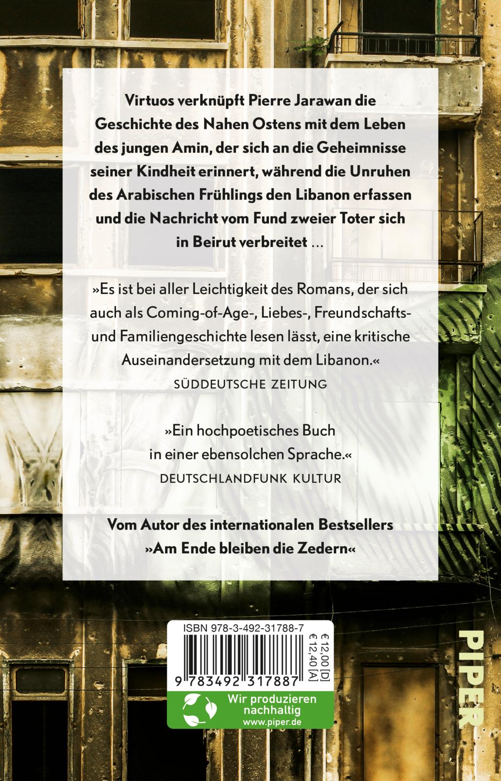 Als 2011 der Arabische Frühling voll entfacht ist, löst der Fund zweier Leichen auch in Beirut erste Unruhen aus. Während schon Häuser brennen, schreibt Amin seine Erinnerungen nieder: an das Jahr 1994, als er als Jugendlicher mit seiner Großmutter aus Deutschland in den Libanon zurückkehrte - zwölf Jahre nach dem Tod seiner Eltern. An seine Freundschaft mit Jafar, mit dem er diese verschwiegene Nachkriegswelt durchstreifte. Und daran, wie er lernen musste, dass es in diesem Land nie Gewissheit geben wird - weder über die Vergangenheit seines Freundes noch über die Geschichte seiner Familie.
