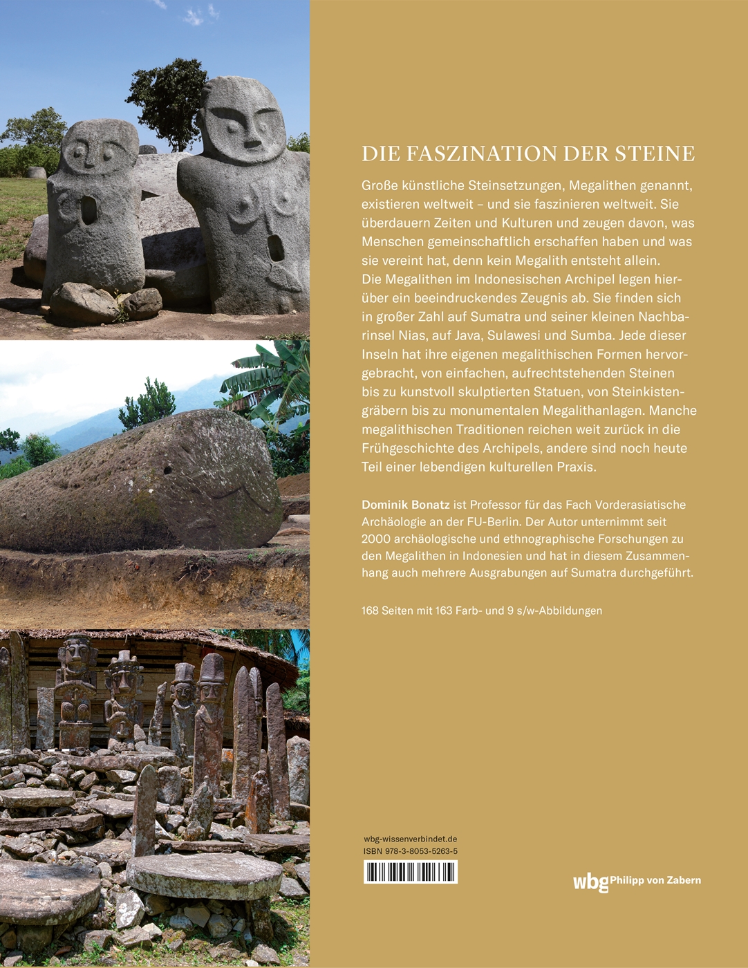 Sumatra, Nias, Sulawesi, Java und Sumba: Dominik Bonatz stellt die Megalithanlagen aus zwölf Regionen, verteilt auf diese fünf Inseln, in Text und Bild vor. Die individuelle Gestaltung der Steinmonumente gibt Einblick in die vergessenen Kulturen, die sie erschufen. Ihre Bedeutung und Verwendung reicht von Totenkult bis zu Kaffeemörser. Gerade dieser Formen- und Ideenreichtum bildet das verbindende Merkmal: Kein Megalith entsteht alleine. Allen Monumenten gemeinsam ist die Bereitschaft einer Gemeinschaft, die erforderliche Zeit und Energie zu investieren, um sie zu errichten.