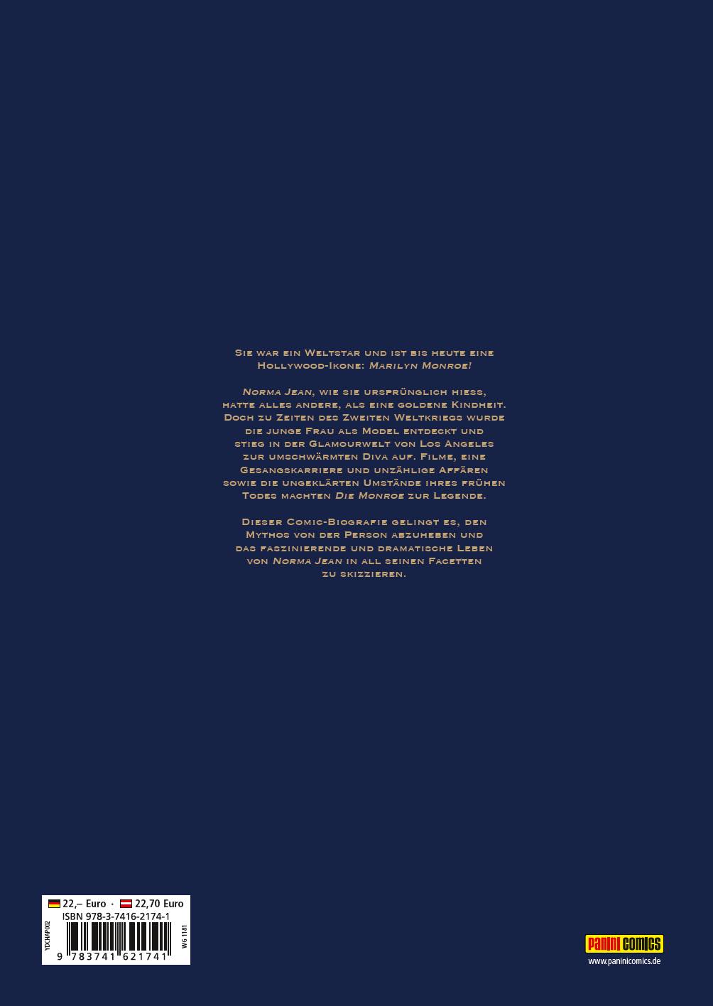 Sie war ein Weltstar und ist bis heute eine Hollywood-Ikone: Marilyn Monroe. Norma Jean, wie sie ursprünglich hieß, hatte alles andere als eine goldene Kindheit. Doch während der Wirren des Zweiten Weltkriegs wurde die junge Frau als Model entdeckt und stieg in der Glamourwelt von Los Angeles zur umschwärmten Diva auf. Filme, eine Gesangskarriere und unzählige Affären (unter anderem vielleicht mit einem Präsidenten), sowie die ungeklärten Umstände ihres frühen Todes machten Die Monroe zur Legende. Diese Comic-Biografie gelingt es, mit viel Humor, den Mythos von der Person abzuheben und das faszinierende Leben von Norma Jean in all seinen Facetten zu skizzieren.