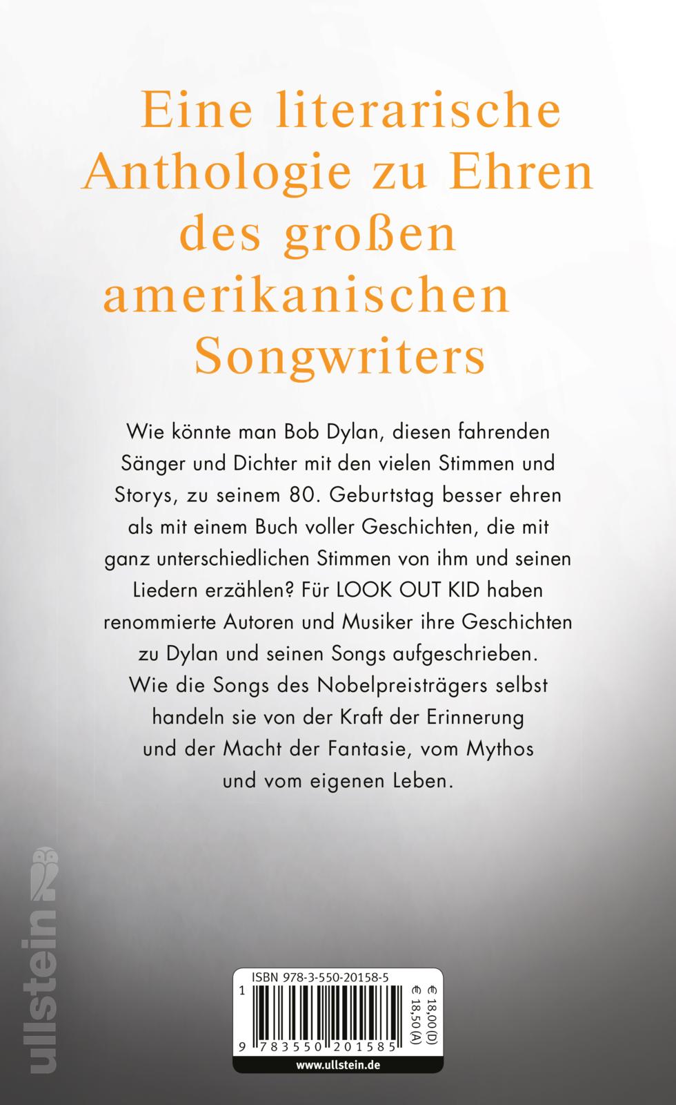 Wie könnte man Bob Dylan, diesen fahrenden Sänger und Dichter mit den vielen Stimmen und Geschichten, zu seinem 80. Geburtstag besser ehren als mit einem Buch voller Geschichten, die mit ganz unterschiedlichen Stimmen von ihm und seinen Liedern erzählen? Für LOOK OUT KID haben renommierte und beliebte Erzähler und Künstler ihre persönlichen Geschichten über Dylan und seine Songs geschrieben – darunter Benedict Wells, Judith Holofernes, Jan Brandt, Christiane Rösinger und viele andere. Wie bei Dylan selbst sind einige Storys dem Leben abgeschaut, andere sind fiktional, und manche handeln von einem bestimmten Song des wohl größten amerikanischen Songwriters.
