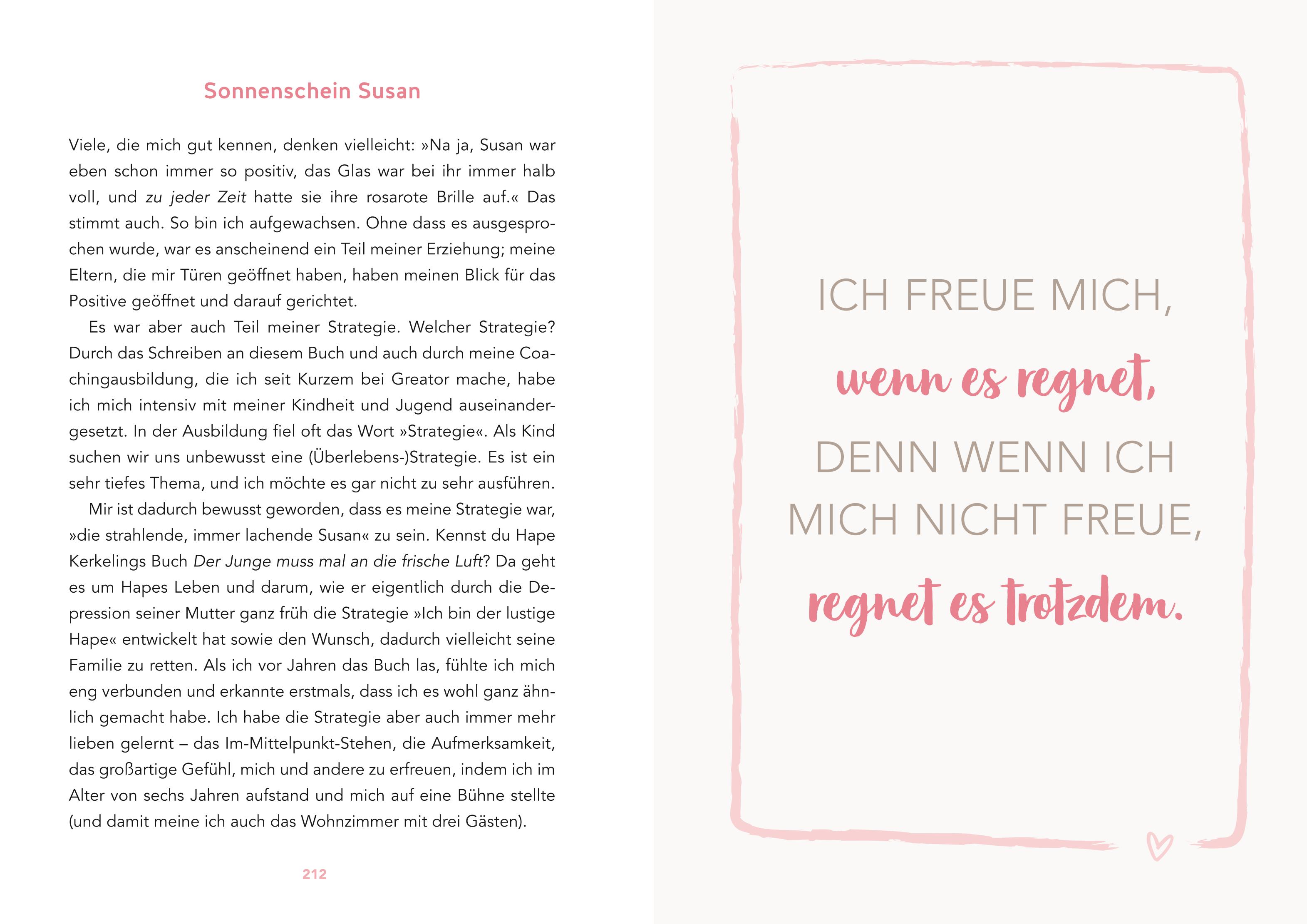 In zauberhaftem Plauderton, herzlich, aufrichtig, nahbar, nimmt Susan uns deshalb mit auf ihre Lebensreise und zeigt uns, wie viel besser es sich mit einer rosaroten Sicht auf die Dinge leben lässt.