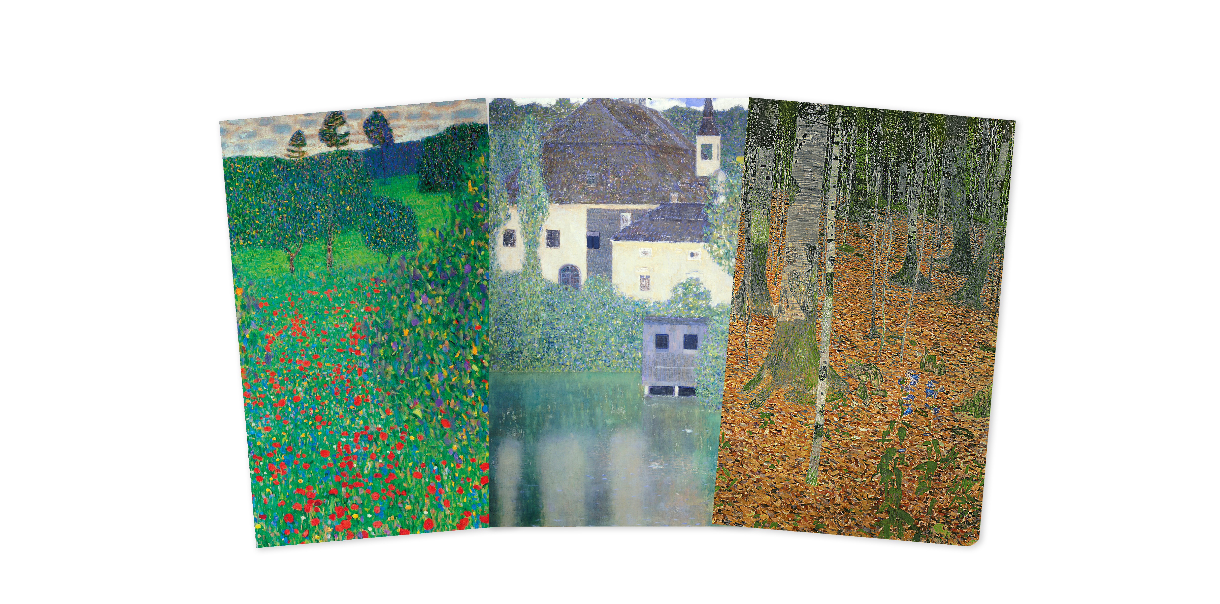 The Klimt Landscapes Set of 3 Mini Notebooks features a collection of three mini, foiled notebooks with alternating lined and blank pages. Each notebook has a different beautiful design: Poppy Field, Water Castle (1908) and The Birch Wood (1903). With a sturdy cover and rounded corners, they are perfect to be carried everywhere!