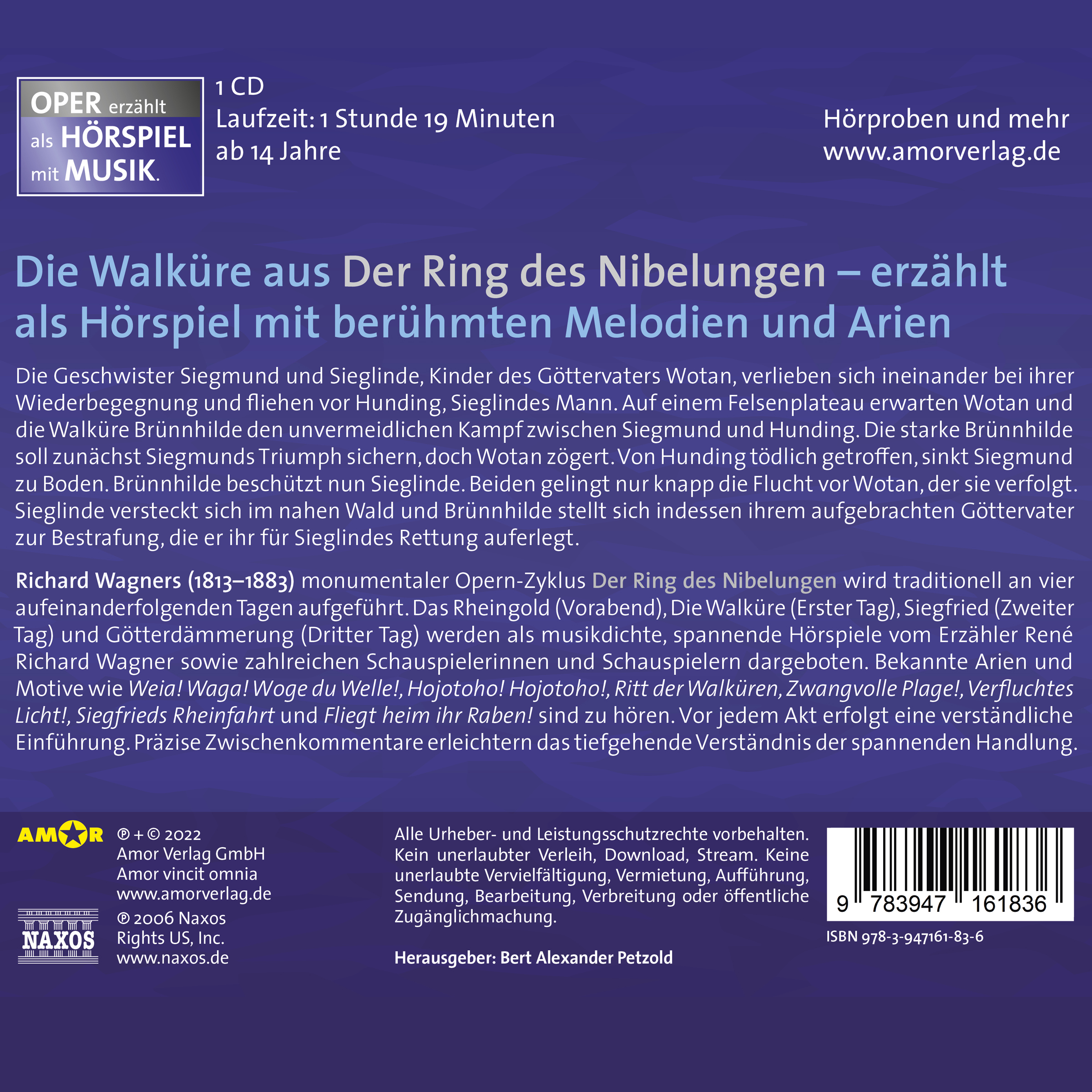 "Berührungsängste haben aber auch Erwachsene und als Antwort entstand eine zweite Bearbeitung im Rahmen der Reihe Oper erzählt als Hörspiel mit Musik, die jetzt komplett im Amor Verlag erschienen ist. Sie zeigt die Elemente der Oper stärker separiert: Meist folgen auf einen sprachlichen Teil eine kurze inhaltliche Zusammenfassung der anstehenden Szenen, Regieanweisungen und Hinweise zur Musik, ein entsprechender Ausschnitt aus der Oper und darauf die hörspielerische Umsetzung. Wird in der ZEIT-Edition noch mehr Wert auf Zugänglichkeit und einen guten Überblick gelegt, werden hier in die Dialoge mehr Elemente des Librettos und seiner altertümlichen Diktion integriert. So wird der Zyklus umfassender wiedergegeben. Die Darstellung steht der Vorlage näher, verlangt aber auch etwas mehr Aufmerksamkeit. 'Der Originale Werkcharakter der Oper steht im Mittelpunkt', sagt Petzold. 'Bei der Konzeption dieser Serie ging es mir primär darum ein Format zu finden, welches erfahrenen und neuen Opernbesuchern einen leichteren Zugang zu den teilweise komplexen Opernstoffen ermöglicht – im Wohnzimmer statt im Opernhaus. Das ist erklärtes Ziel dieser Hörspiele." HÖRBUCHmagazin