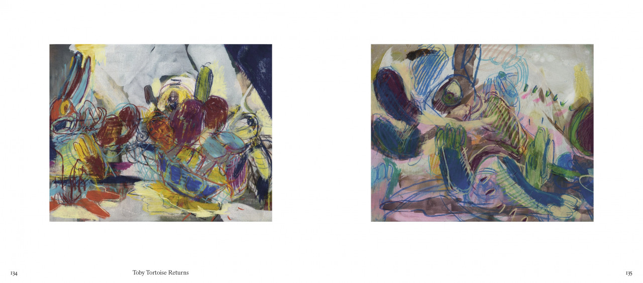 Areas of abstract composition in solid hues and swirling hachures overlap with comic-strip eyes, paws, and wide-open mouths; a tinted haze wafts over the me le e. The titles-Moses encodes his works with alphanumeric keys and timestamps for the selected frames-already suggest the artist's skepticism concerning the affirmative power of animation. What remains are snippets of characters as aesthetic anchors, disjected members loosely embed- ded in otherwise abstract painting. Through color, line, overpainting, and facement, Moses relieves his heroes and heroines of their pedagogical tenor and cultural-historical baggage. Rather than the plots of his filmic sources, it is the theatricality of the characters that inspires the artist in his engaging expeditions into the media archive.