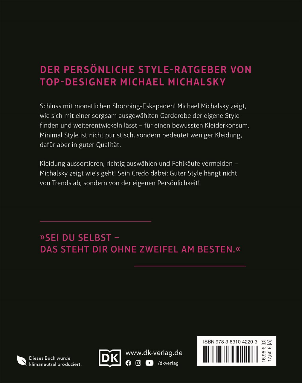 | Schlagworte | Atelier Michalsky • bewusster Umgang mit Mode • Capsule Wardrobe • Designer • Fast Fashion • Germany's Next Topmodel • GNTM • Kleidung • lifestyle • Minimalismus • minimalismus im kleiderschrank • minimalistische Garderobe • minimalistischer kleiderschrank • Mode • mode buch • Mode-Designer • Mode Guide • Modeindustrie • Nachhaltigkeit • Sachbuch • Slow Fashion • Stilberater • Stil Ratgeber • Styleguide • Style Ratgeber • stylish kleiden • Weniger ist mehr |