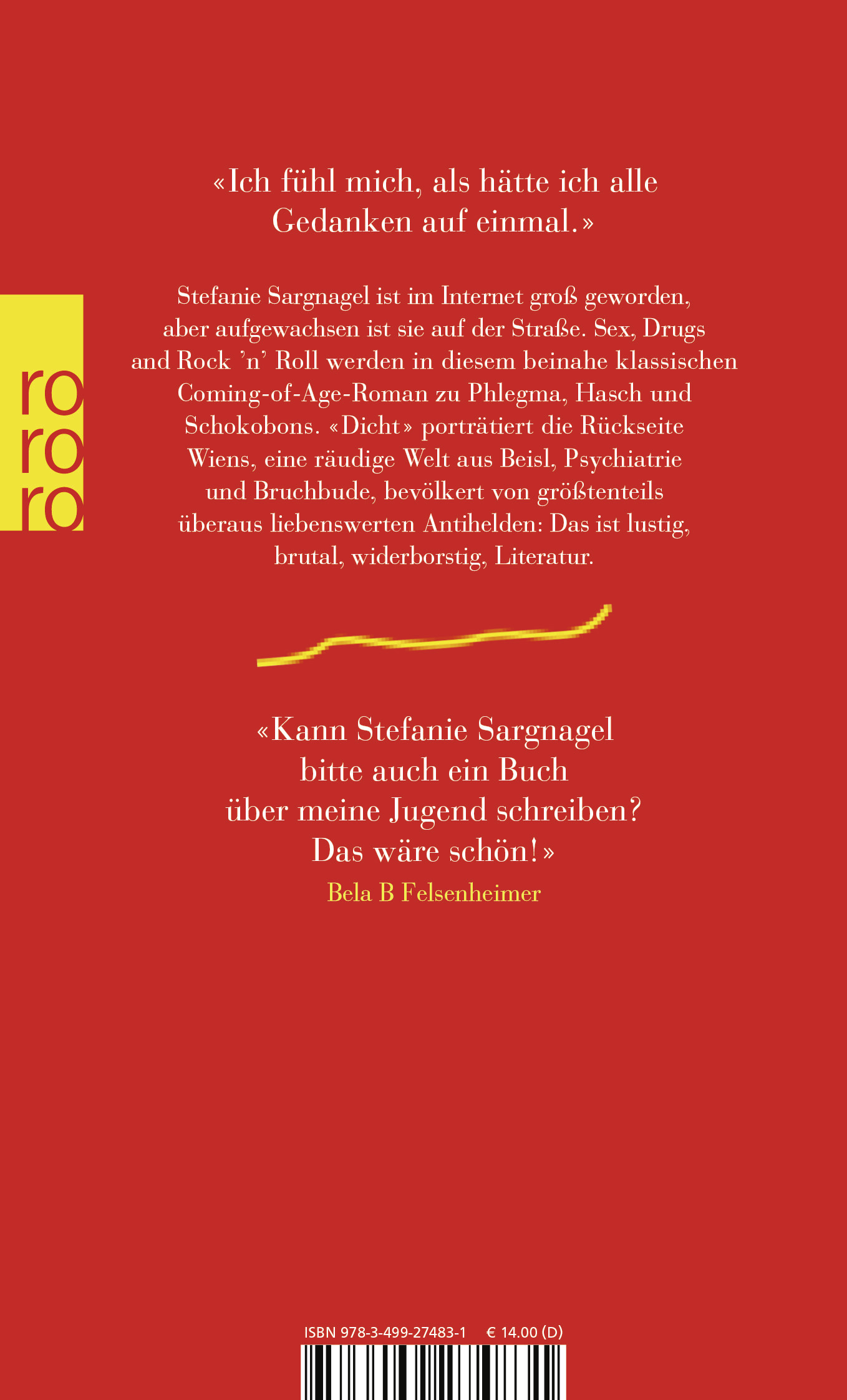Stefanie Sargnagel ist im Internet groß geworden, aber aufgewachsen ist sie auf der Straße. Sex, Drugs and Rock 'n' Roll werden in diesem beinahe klassischen Coming-of-Age-Roman zu Phlegma, Hasch und Schokobons. «Dicht» porträtiert die Rückseite Wiens, eine räudige Welt aus Beisl, Psychiatrie und Bruchbude, bevölkert von größtenteils überaus liebenswerten Antihelden: Das ist lustig, brutal, widerborstig, Literatur.