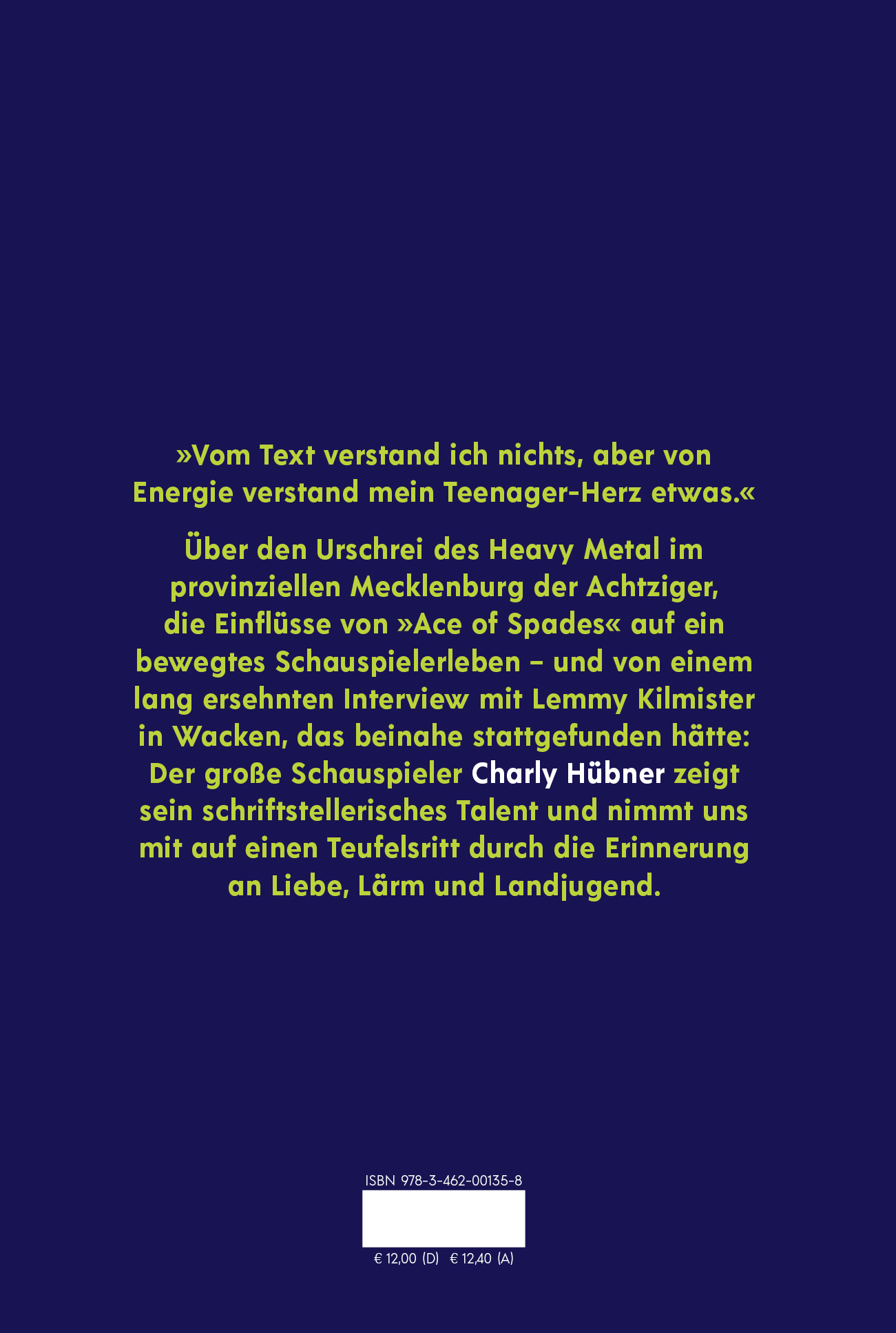 Über den Urschrei des Heavy Metal im provinziellen Mecklenburg der Achtziger, die Einflüsse von »Ace of Spades« auf ein bewegtes Schauspielerleben - und von einem lang ersehnten Interview mit Lemmy Kilmister in Wacken, das beinahe stattgefunden hätte: Der große Schauspieler Charly Hübner zeigt sein schriftstellerisches Talent. Selten wurde so leidenschaftlich über Musik geschrieben, selten so eindrücklich über den Effekt, den diese auf einen Jugendlichen haben kann - ein Effekt, der nachwirkt und sich immer wieder neu entfaltet.