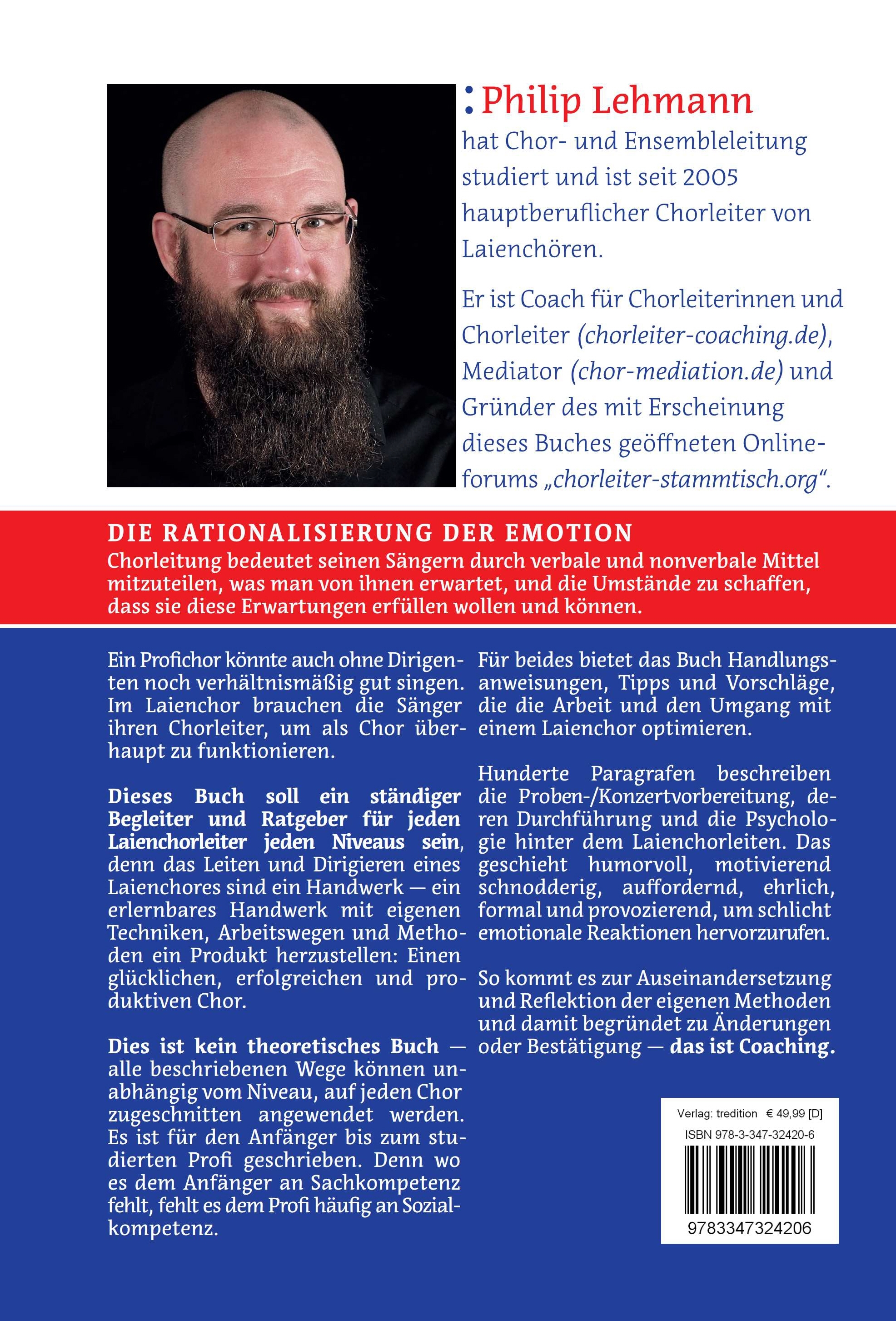 Philip Lehmann hat Chor- und Ensembleleitung studiert und ist seit 2005 hauptberuflicher Chorleiter von Laienchören. Er ist Coach für Chorleiterinnen und Chorleiter (chorleiter-coaching.de), Mediator (chor-mediation.de) und Gründer des mit Erscheinung dieses Buches geöffneten Onlineforums "chorleiter-stammtisch.org".