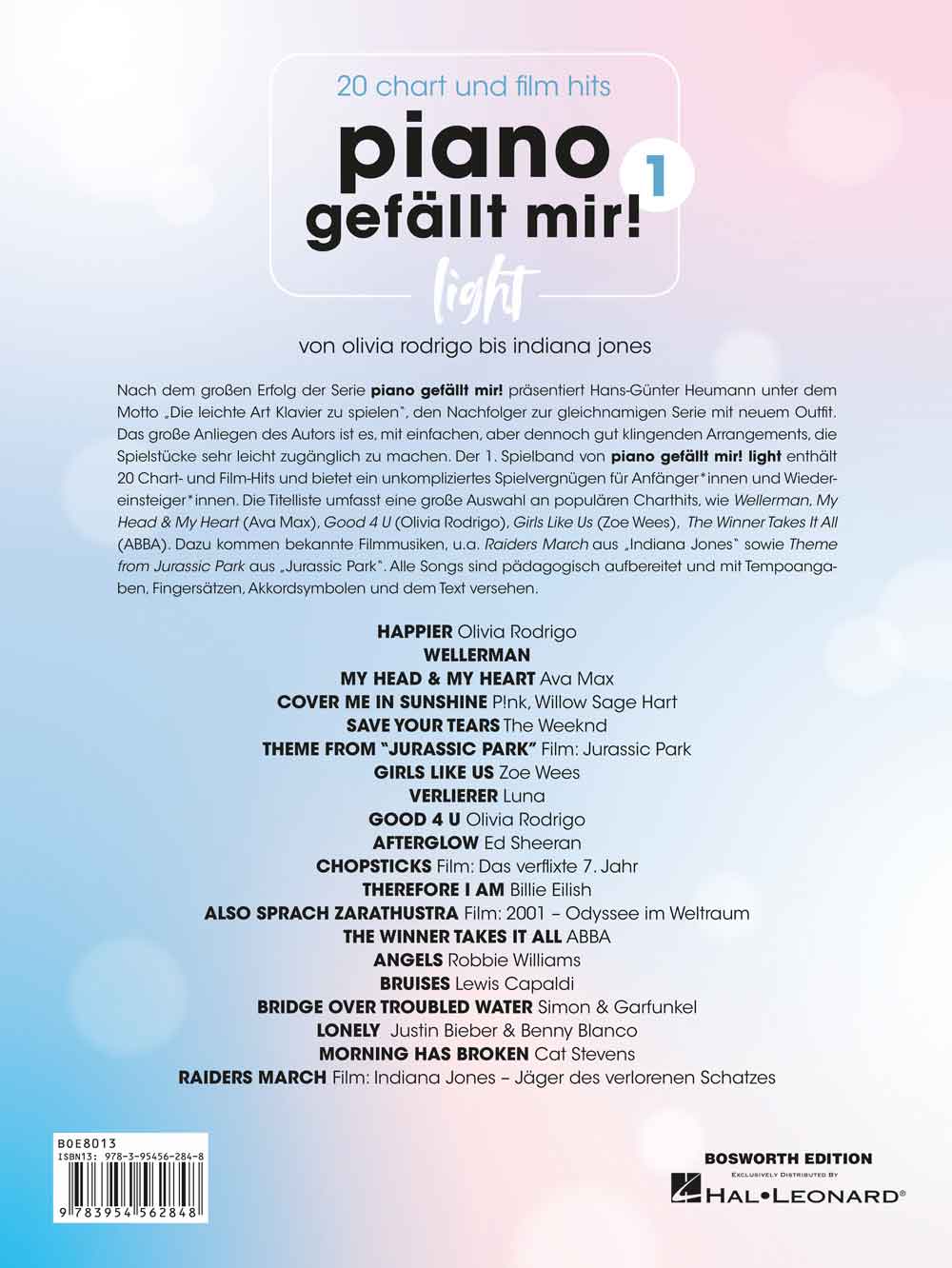 Nach dem großen Erfolg der Serie piano gefällt mir! präsentiert Hans-Günter Heumann unter dem Motto „Die leichte Art Klavier zu spielen“, den Nachfolger zur gleichnamigen Serie mit neuem Outfit. Das große Anliegen des Autors ist es, mit einfachen, aber dennoch gut klingenden Arrangements, die Spielstücke sehr leicht zugänglich zu machen. Der 1. Spielband von piano gefällt mir! light enthält 20 Chart- und Film-Hits und bietet ein unkompliziertes Spielvergnügen für Anfänger*innen und Wiedereinsteiger* innen. Die Titelliste umfasst eine große Auswahl an populären Charthits, wie Wellerman, My Head & My Heart (Ava Max), Good 4 U (Olivia Rodrigo), Girls Like Us (Zoe Wees), The Winner Takes It All (ABBA). Dazu kommen bekannte Filmmusiken, u.a. Raiders March aus „Indiana Jones“ sowie Theme from Jurassic Park aus „Jurassic Park“. Alle Songs sind pädagogisch aufbereitet und mit Tempoangaben, Fingersätzen, Akkordsymbolen und dem Text versehen.