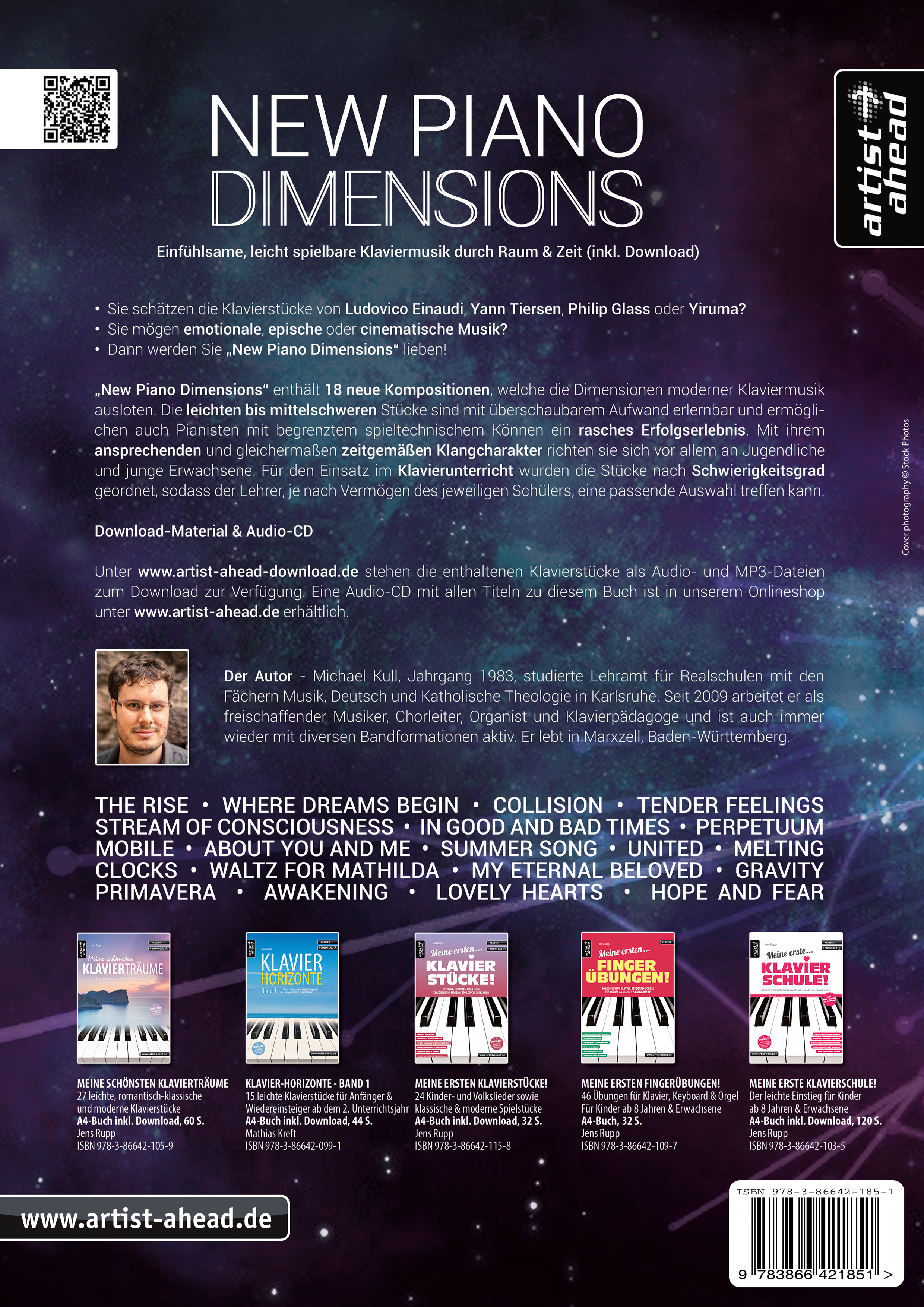 "New Piano Dimensions" enthält 18 neue Kompositionen, welche die Dimensionen moderner Klaviermusik ausloten. Die leichten bis mittelschweren Stücke sind mit überschaubarem Aufwand erlernbar und ermöglichen auch Pianistinnen und Pianisten mit begrenztem spieltechnischem Können ein rasches Erfolgserlebnis. Mit ihrem ansprechenden und gleichermaßen zeitgemäßen Klangcharakter richten sie sich vor allem an Jugendliche und junge Erwachsene. Für den Einsatz im Klavierunterricht wurden die Stücke nach Schwierigkeitsgrad geordnet, sodass der Lehrer, je nach Vermögen des jeweiligen Schülers, eine passende Auswahl treffen kann.