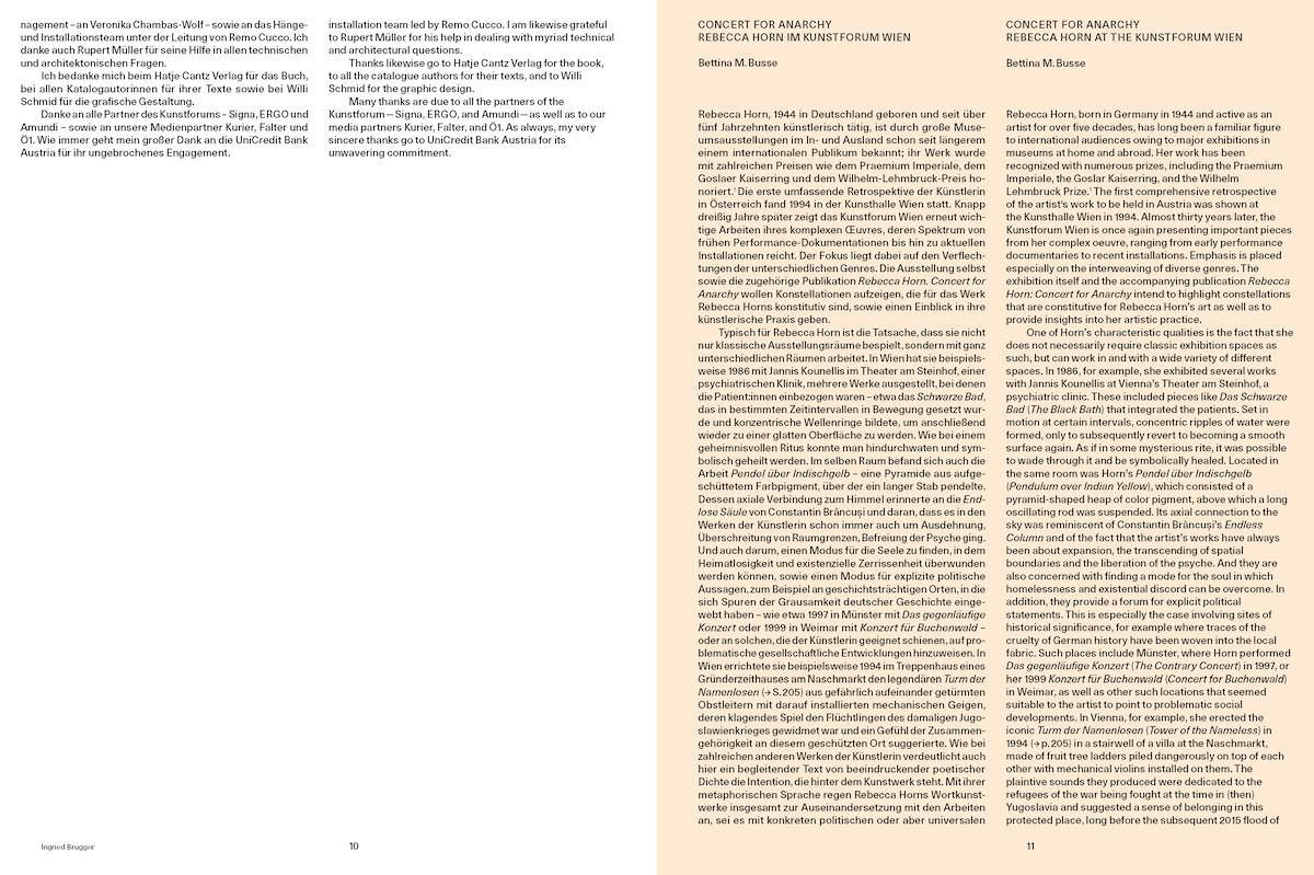 Realität und Fiktion, Materie und Geist, Subjekt und Objekt - bei der Künstlerin Rebecca Horn werden diese Grenzen ständig überschritten. Auch die Medien sind für sie nicht klar getrennt, sondern deren Verflechtung ist Teil ihres künstlerischen Prinzips. Der Katalog erscheint zur umfassenden Werkschau der Künstlerin im Bank Austria Kunstforum Wien und widmet sich dieser Perspektive auf ihr Werk. Essays namhafter Autorinnen eröffnen einen neuen Blick auf das fünf Jahrzehnte umfassende Schaffen von Horn, von ihren frühen Körperinstrumenten und Performances, über die Spielfilme und kinetischen Skulpturen bis zu den ortsspezifischen Installationen, Zeichnungen oder Gedichten. Dabei werden die zahlreichen Beziehungen zu Kunst-, Literatur- und Filmtraditionen ebenso beleuchtet wie Horns Nähe zu Themen aus der Mythologie und Märchenwelt.