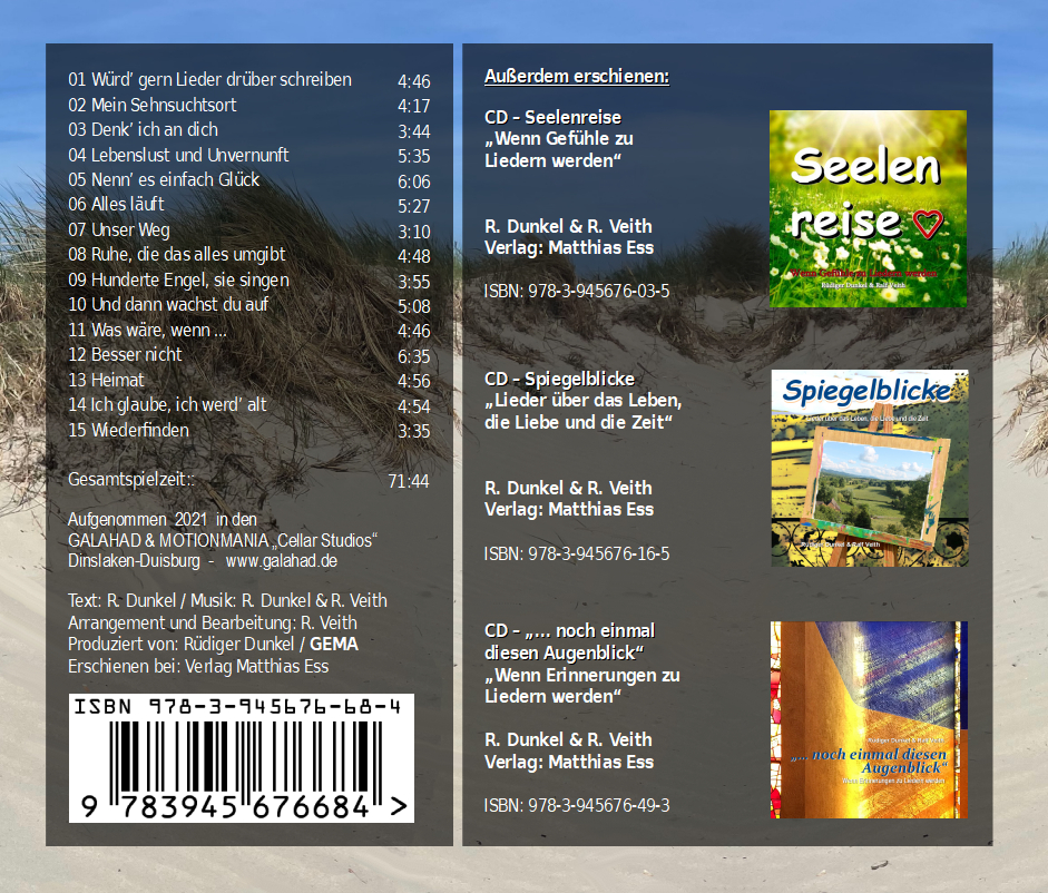 " Nenn' es einfach Glück" heißt die neuste CD von Rüdiger Dunkel und Ralf Veith aus dem Jahr 2021. Rüdiger Dunkel erzählt wieder neue Geschichten in seinen Liedern, die diesmal besonders - aber nicht nur - vom Älterwerden, der Liebe und Dankbarkeit handeln. Mit seinen Liedern möchte er seine Gedanken mit allen, die seine Lieder hören, teilen. Sein musikalischer Partner Ralf Veith nimmt diese Gedanken auf und verziert sie mit teils ruhigen, teils beschwingten Melodien und Arrangements. Auch dieses mal ist wieder ein sehr emotionales Album mit äußerst abwechslungsreicher Musik entstanden.
