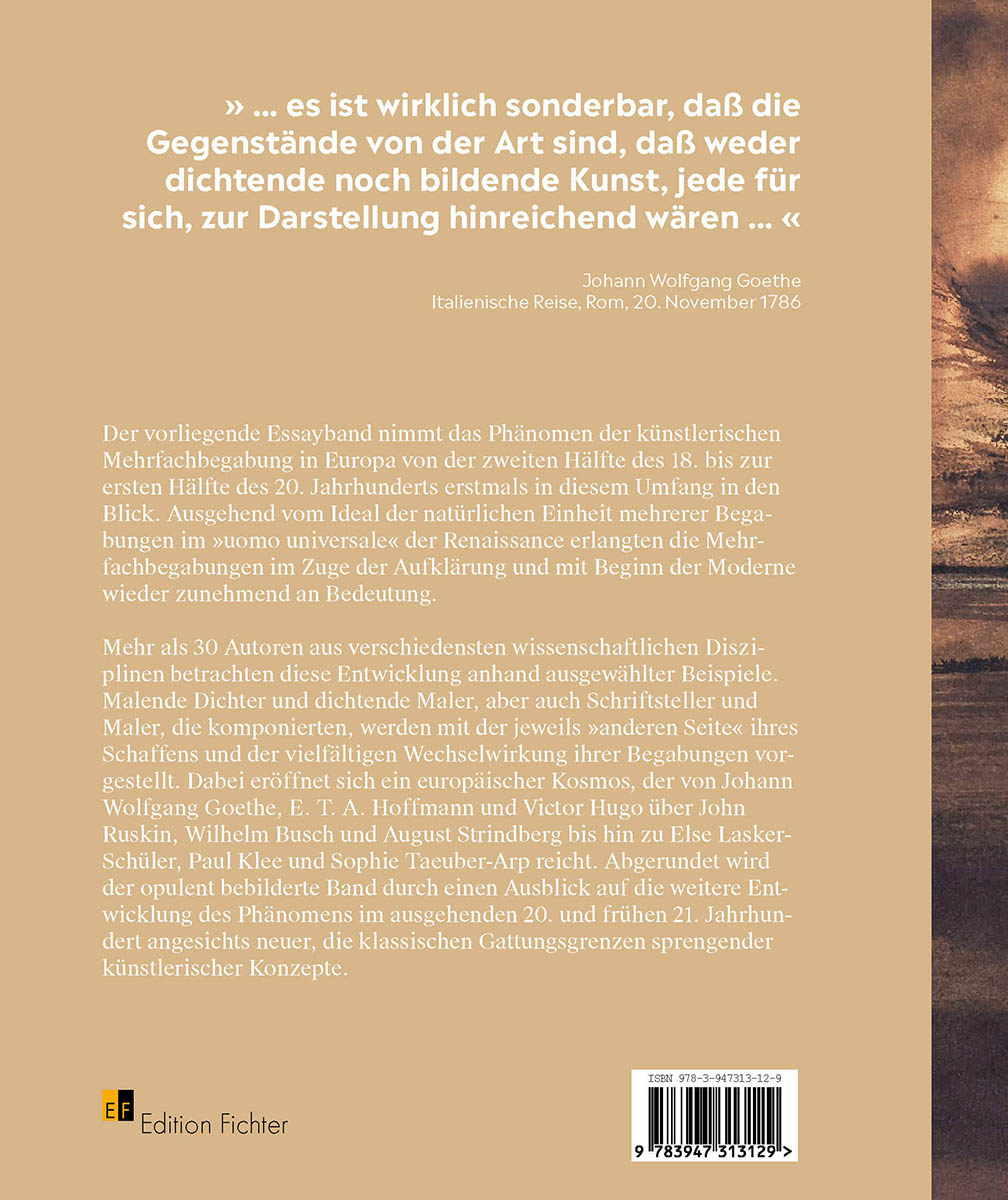 Der vorliegende Essayband nimmt das Phänomen der künstlerischen Mehrfachbegabung in Europa von der zweiten Hälfte des 18. bis zur ersten Hälfte des 20. Jahrhunderts erstmals in diesem Umfang in den Blick. Ausgehend vom Ideal der natürlichen Einheit mehrerer Begabungen im "uomo universale" der Renaissance erlangten die Mehrfachbegabungen im Zuge der Aufklärung und mit Beginn der Moderne wieder zunehmend an Bedeutung. Mehr als 30 Autoren aus verschiedensten wissenschaftlichen Disziplinen betrachten diese Entwicklung anhand ausgewählter Beispiele. Malende Dichter und dichtende Maler, aber auch Schriftsteller und Maler, die komponierten, werden mit der jeweils "anderen Seite" ihres Schaffens und der vielfältigen Wechselwirkung ihrer Begabungen vorgestellt. Dabei eröffnet sich ein europäischer Kosmos, der von Johann Wolfgang Goethe, E. T. A. Hoffmann und Victor Hugo über John Ruskin, Wilhelm Busch und August Strindberg bis hin zu Arnold Schönberg, Paul Klee und Sophie Taeuber-Arp reicht. Abgerundet wird der opulent bebilderte Band durch einen Ausblick auf die weitere Entwicklung des Phänomens im ausgehenden 20. und frühen 21. Jahrhundert angesichts neuer, die klassischen Gattungsgrenzen sprengender künstlerischer Konzepte.